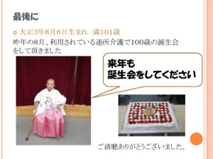 写真は、講師の高島氏のお爺さんが利用する通所介護で100歳の誕生会をしたときのものです。その誕生会でお爺さんは、「来年も誕生会をしてください」と挨拶したそうです。