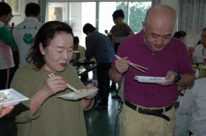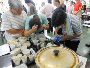 「パッククッキング」とは、ポリ袋に食材に入れて湯せんで火を通す調理法で、災害で、電気、ガス、水道などライフラインが使えなくなっても、カセットコンロ、鍋、水、ポリ袋があれば、簡単な食事を作って食べれるというものです。今回、作ったメニューは、ご飯、炊き込みご飯、焼きそば、ツナじゃが、乾パンの卵とじ。職員、ご利用者、ご家族、施設外の法人職員、合わせて65名の参加者が、楽しみながら「パッククッキング」に挑戦しました。完成した食材を試食した参加者からは一様に「美味しい!」との声が上がりました。
