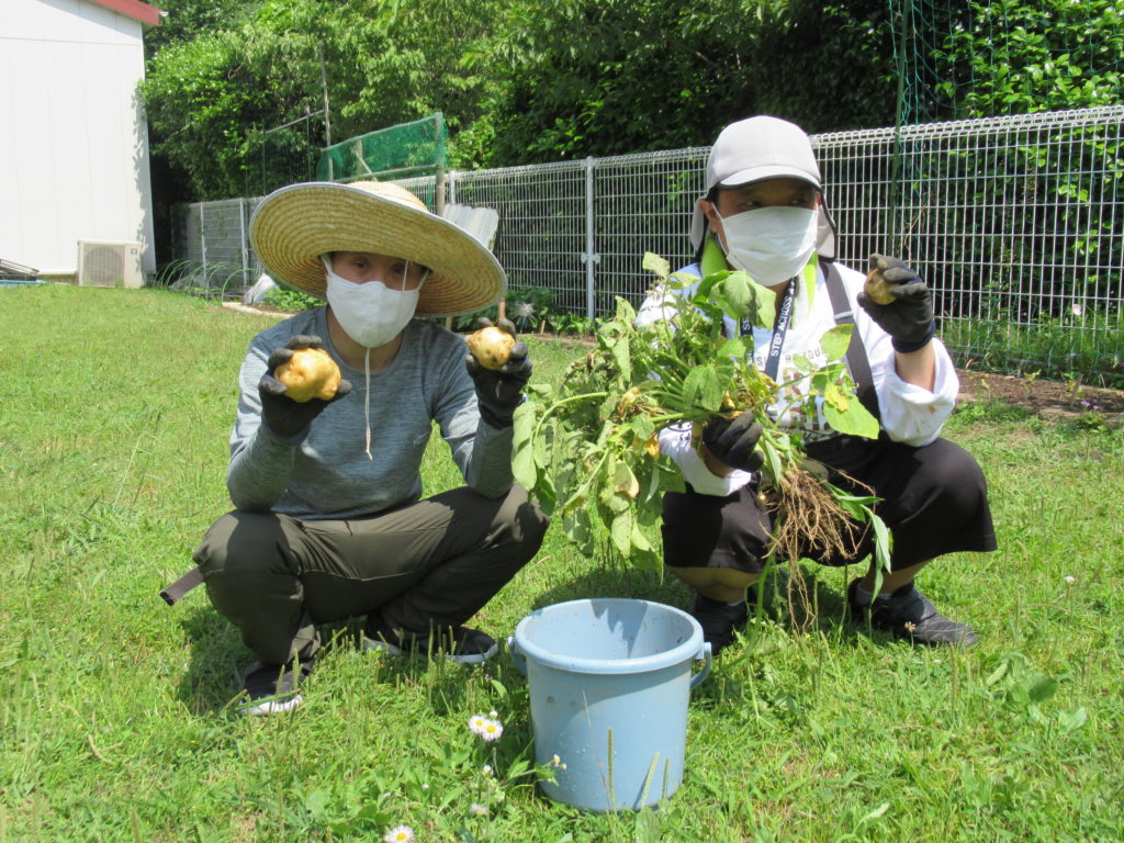 今年も、サツマイモの苗植えを行いました。今年はコロナウイルスの関係で明日香の農業班のみで行いました。種類は「紅はるか」と「紅東」です。秋の収穫を楽しみに、暑い中ではありますが、作業に励みたいと思います。また、午後からは明日香の中庭で育てていたジャガイモの収穫を行いました。収穫したジャガイモは給食のカレーに使い、美味しくいただきました。