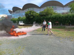 今回は、オイルパンにガソリンを入れて着火したものを、本物の消火器を用いて消火する訓練もしてきました。