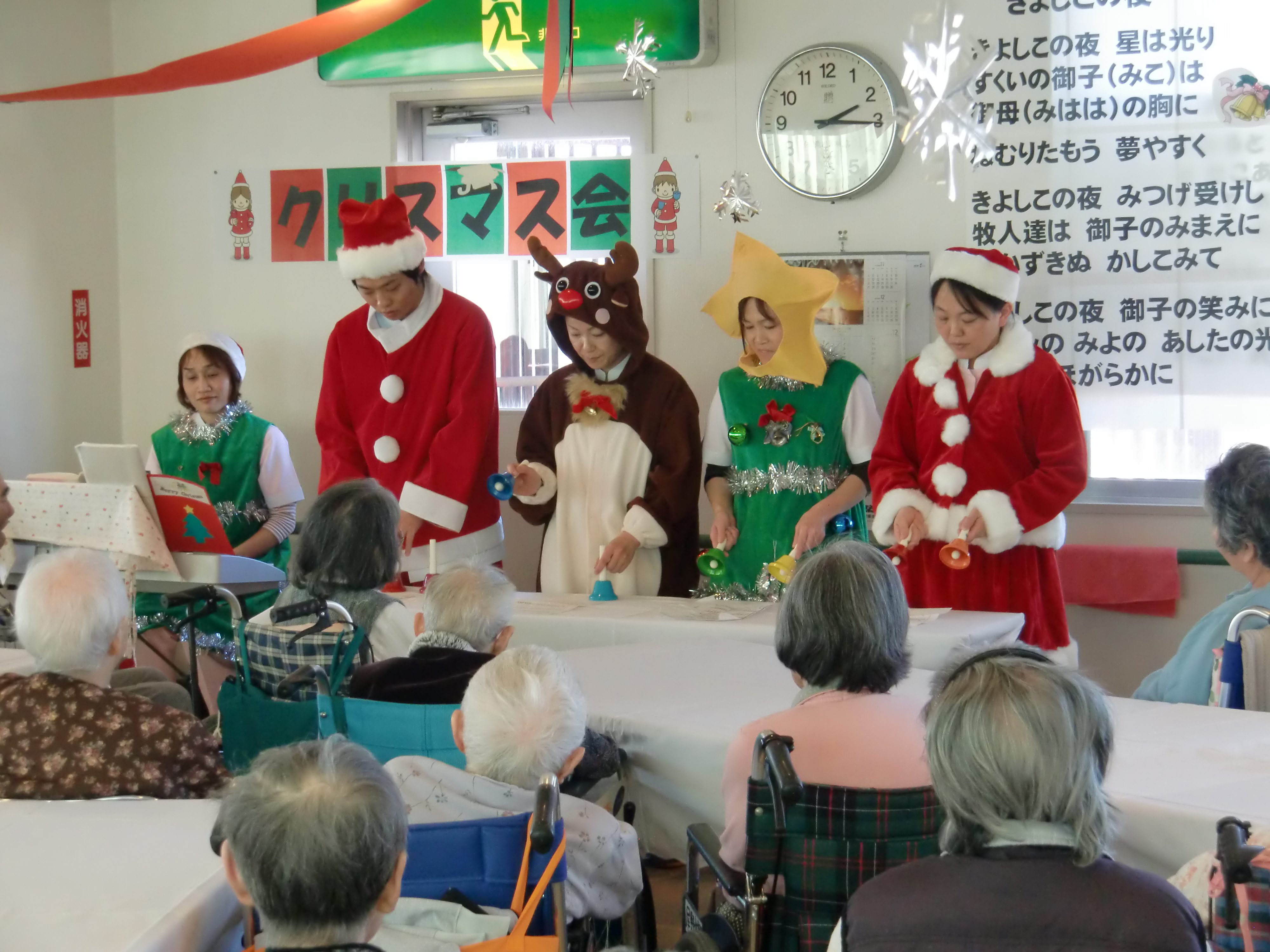 サンタクロースやトナカイに扮した職員が「ジングルベル」をハンドベル演奏し、続いて「赤鼻のトナカイ」と「きよしこの夜」を入所者の皆さんと一緒に歌いました。