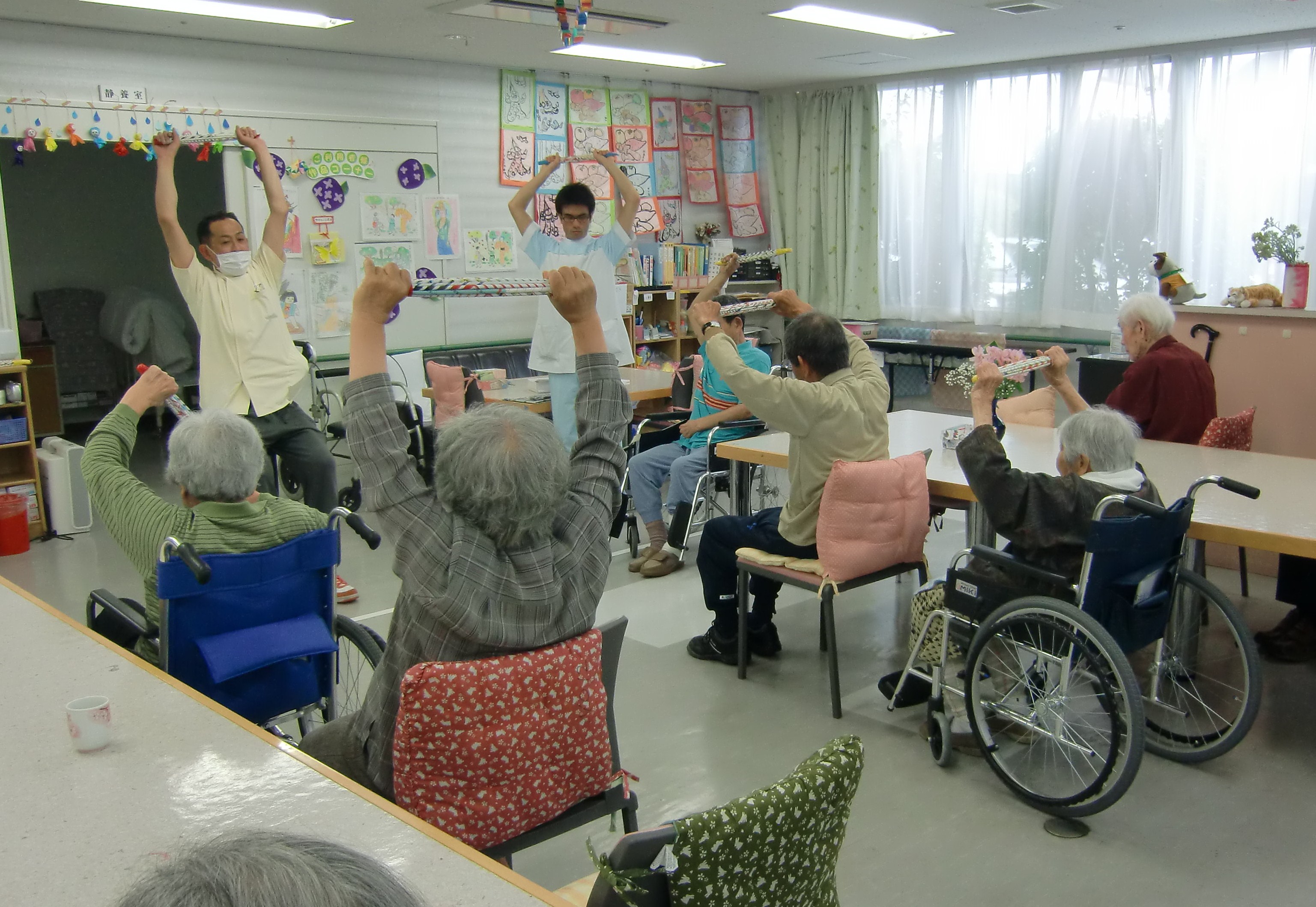 ジュゲムデイケアでは利用者数増加に伴いリハビリ業務を一部見直し、利用される方の機能向上に努めています。その一つとして、今までは2階機能訓練室で行っていたグループでの体操を1階デイルームで行うようにしました。方法も、デイケア利用者様手作りのチラシで作った棒「らくらく棒」を使い、声を出し、音に合わせ看護師、介護士、理学療法士職員同志が協力し、盛り上げながら楽しく身体を動かしています。(西村)