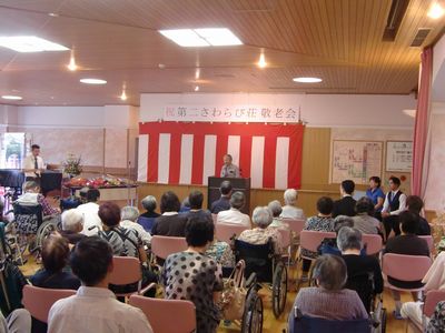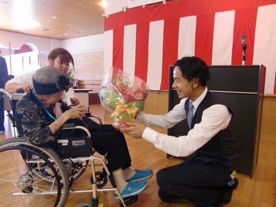 引き続き敬老会が山本ゆかり専務理事の開会の挨拶で始まり、山本孝之理事長からの祝辞、山本左近統括本部長からの花束の贈呈があり、厳かな中にも暖かい雰囲気での敬老祝賀会となりました。
