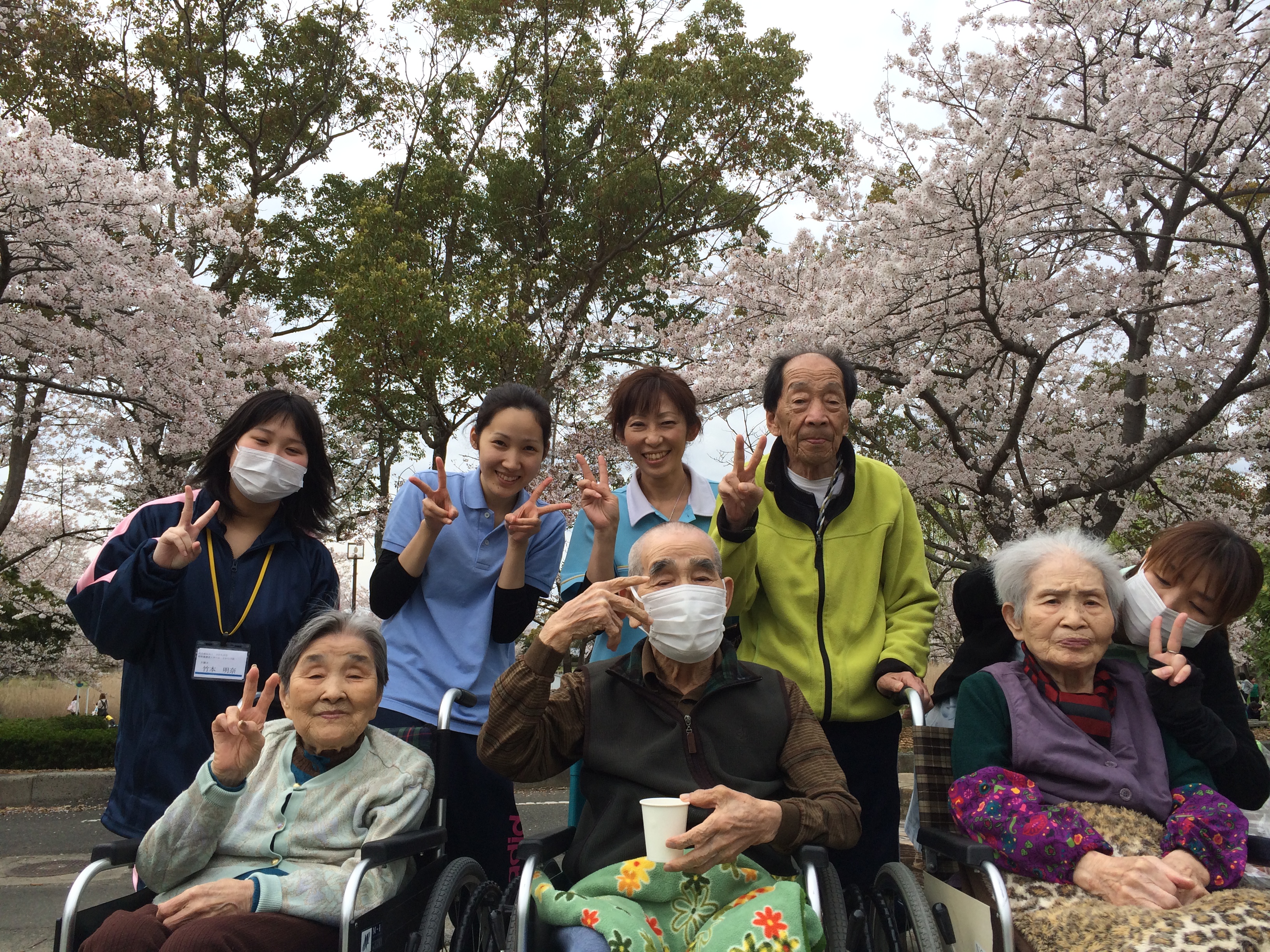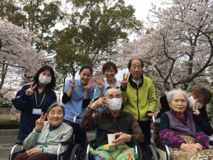 先日行いましたお花見は荘内でしたが、本日は岩田運動公園までお花見をしに行きました。 これ以上ないほどの素晴らしい気候に恵まれ、満開の桜の下お花見をすることができ、入居者様にも大変喜んでいただけました。 また、新人介護職員も同行し、一緒にお花見をすることで、入居者様との関係を深めることができました。