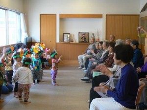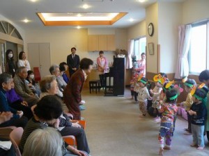 本日ケアハウスカサデローザの利用者の方の誕生会を行いましたが、その際に福祉村保育園の園児さんと先生方約30名がお祝いに来てくださいました。