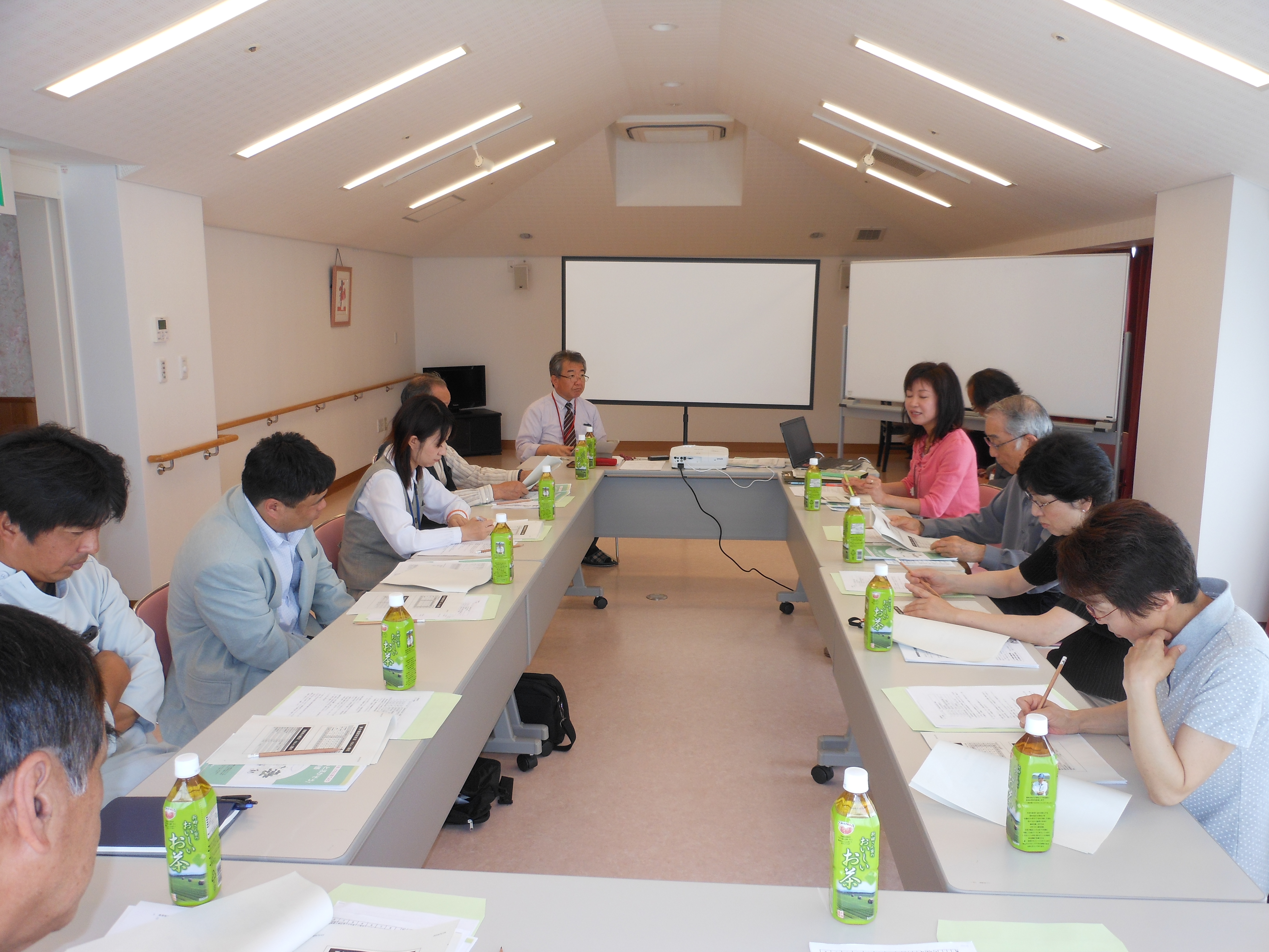 常盤事業報告の後、今回は豊橋市役所長寿介護課にもご参加いただきまして豊橋市の介護認定状況、高齢化の状況、校区別人口などの統計情報を報告していただきました。その後、「地域の連携について」事例を参考に参加者全員で話し合いを行いました。
