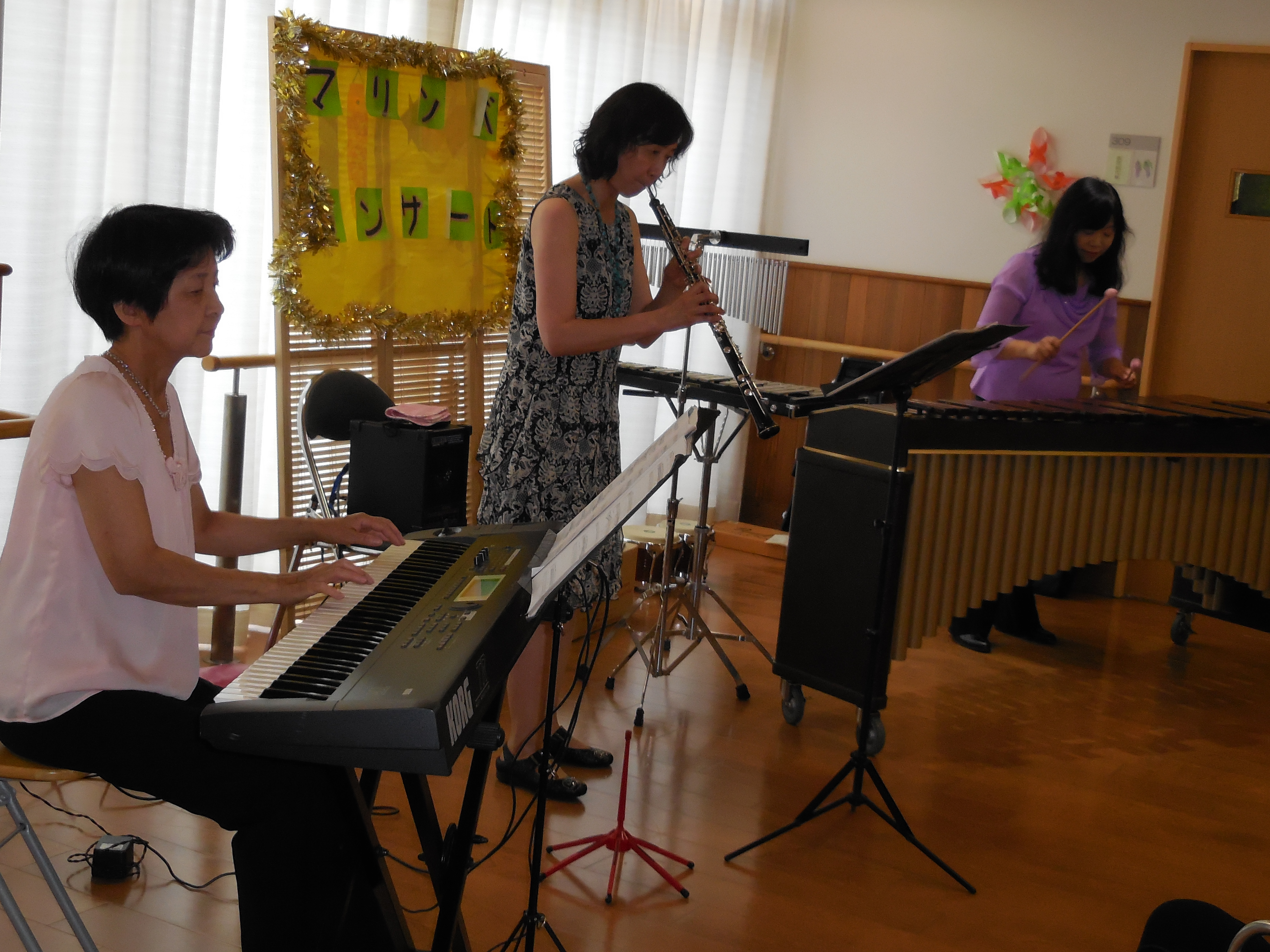 常盤の入居者様のご家族様の紹介で「アンサンブルパレット」様によりますマリンバ、オーボエ、キーボードの演奏会が開催されました。