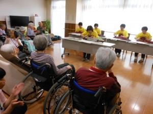 「高原列車は行く」「浜千鳥」「ブルーライト・ヨコハマ」など入居者の皆様にお馴染の懐かしい曲を中心に演奏してくださいましたので、大正琴に合わせて皆様で一緒に口ずさむ演奏会となりました。
