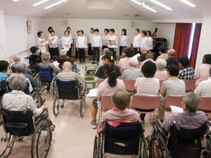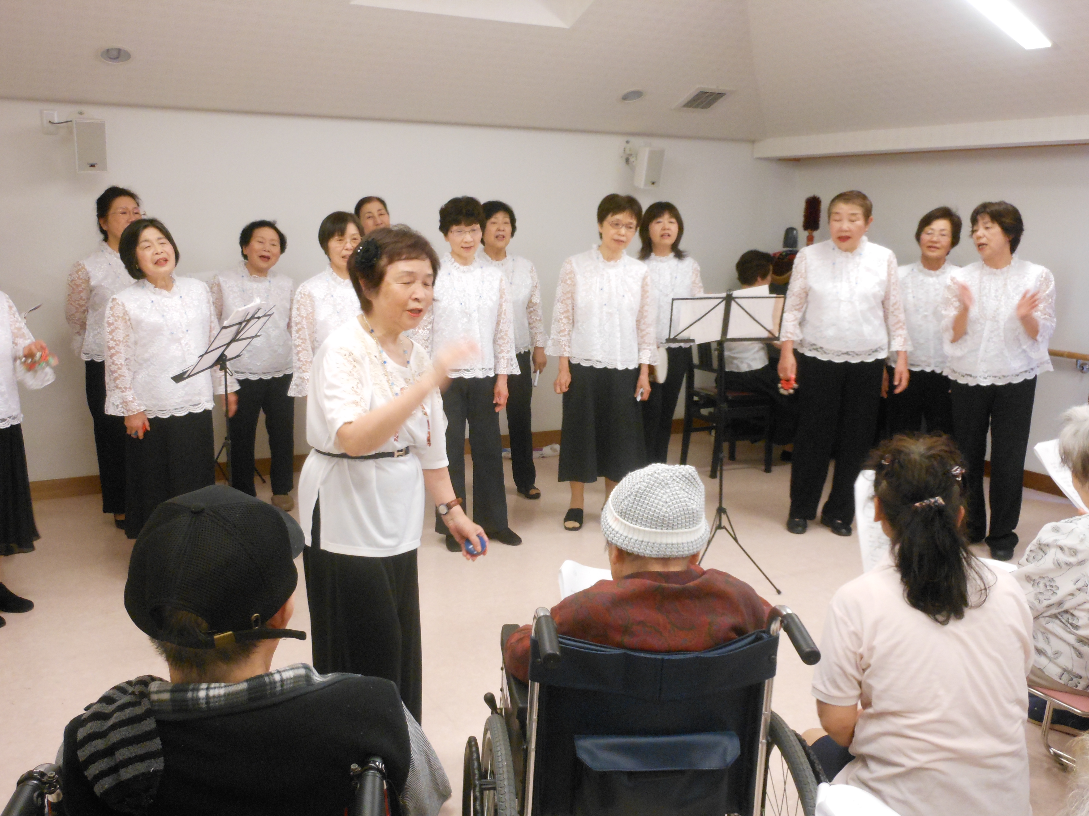 「雨降り」「七夕」「上を向いて歩こう」などの曲をコールシャロンの皆様と入居者の皆様と一緒に歌いまして、とても楽しい歌の交流会となりました。