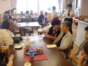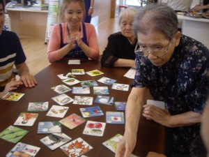 その他にも音楽を流しての唱歌カルタを行い、同じテーブルの方と「この歌はわかる?聴いたことがあるけど、思い出せない」などと楽しく触れ合いながら、知っている曲があれば口ずさんだりと、カフェは大変盛り上がりました。