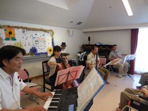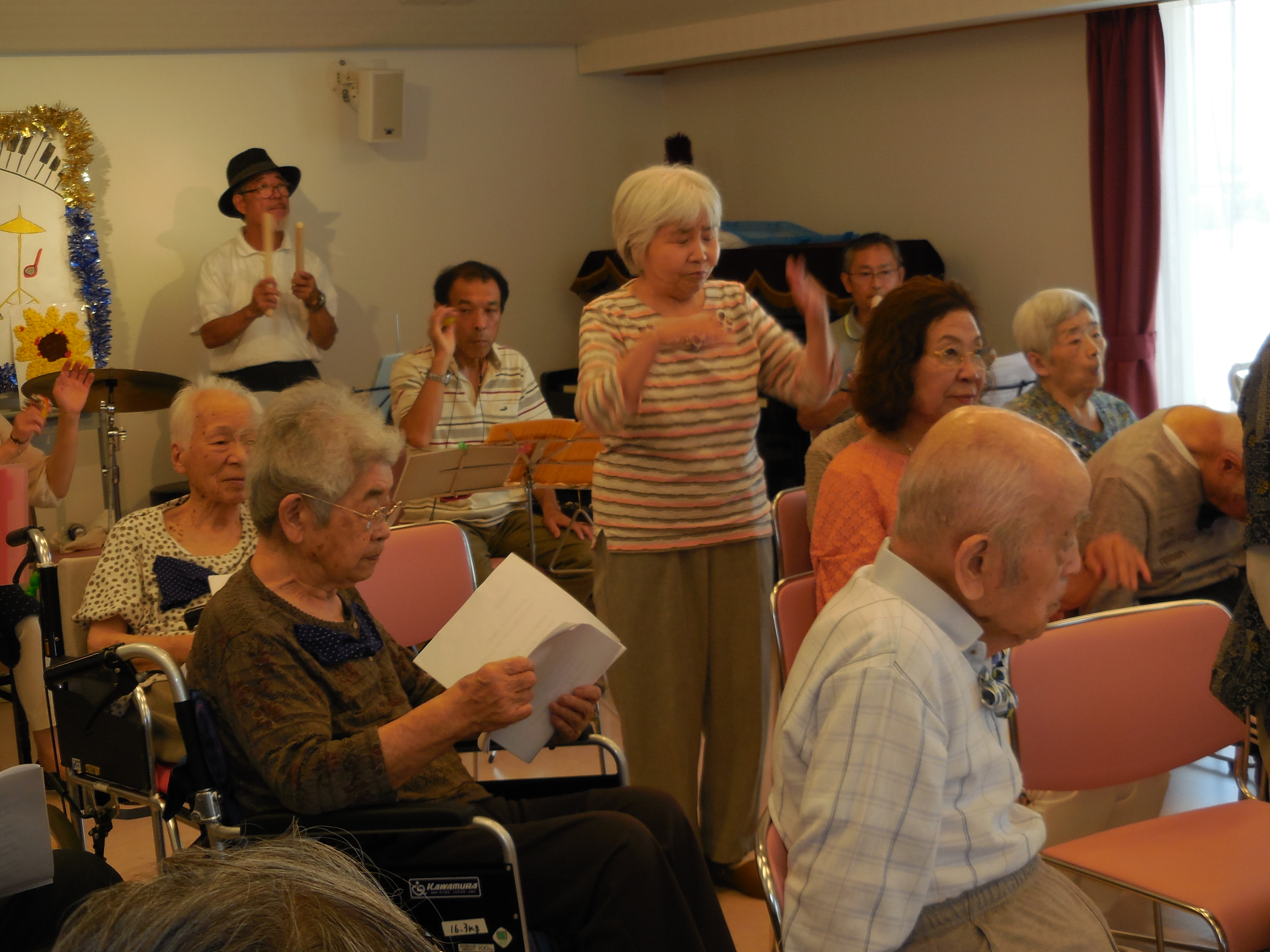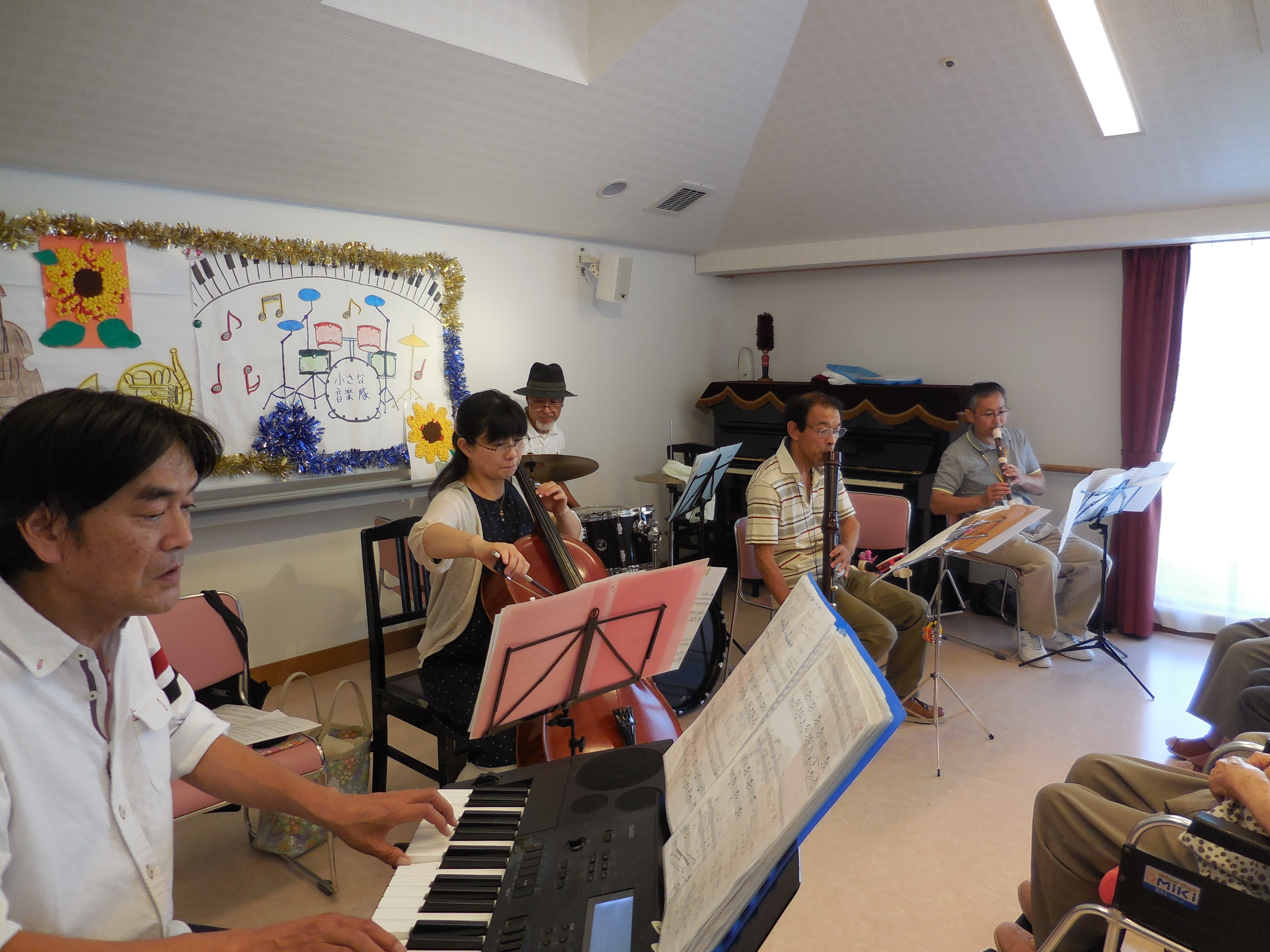 地域でボランティアで音楽活動をされていますバンド「小さな音楽隊」様をお招きしまして、入居者の皆様とご家族の皆様と一緒に歌や踊りを楽しみました。音楽会には特養とデイサービスのご利用者の皆様にも参加していただきました。