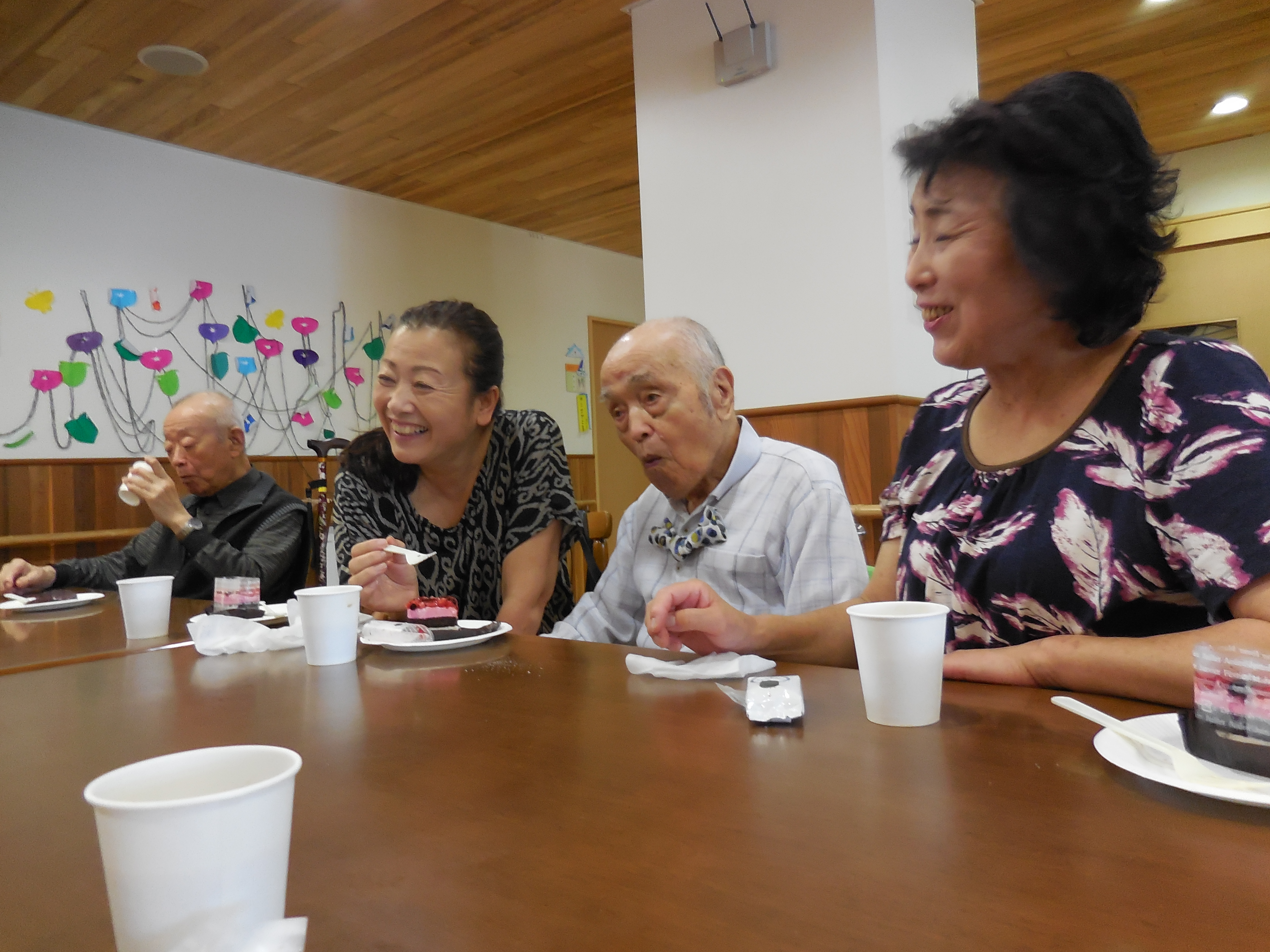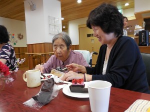 3階に会場を移動して、グループホーム入居者の皆様、12名のご家族の皆様と職員が一緒に、お茶とケーキをいただきながらの交流会は、とても和やかな雰囲気で有意義な時間となりました。