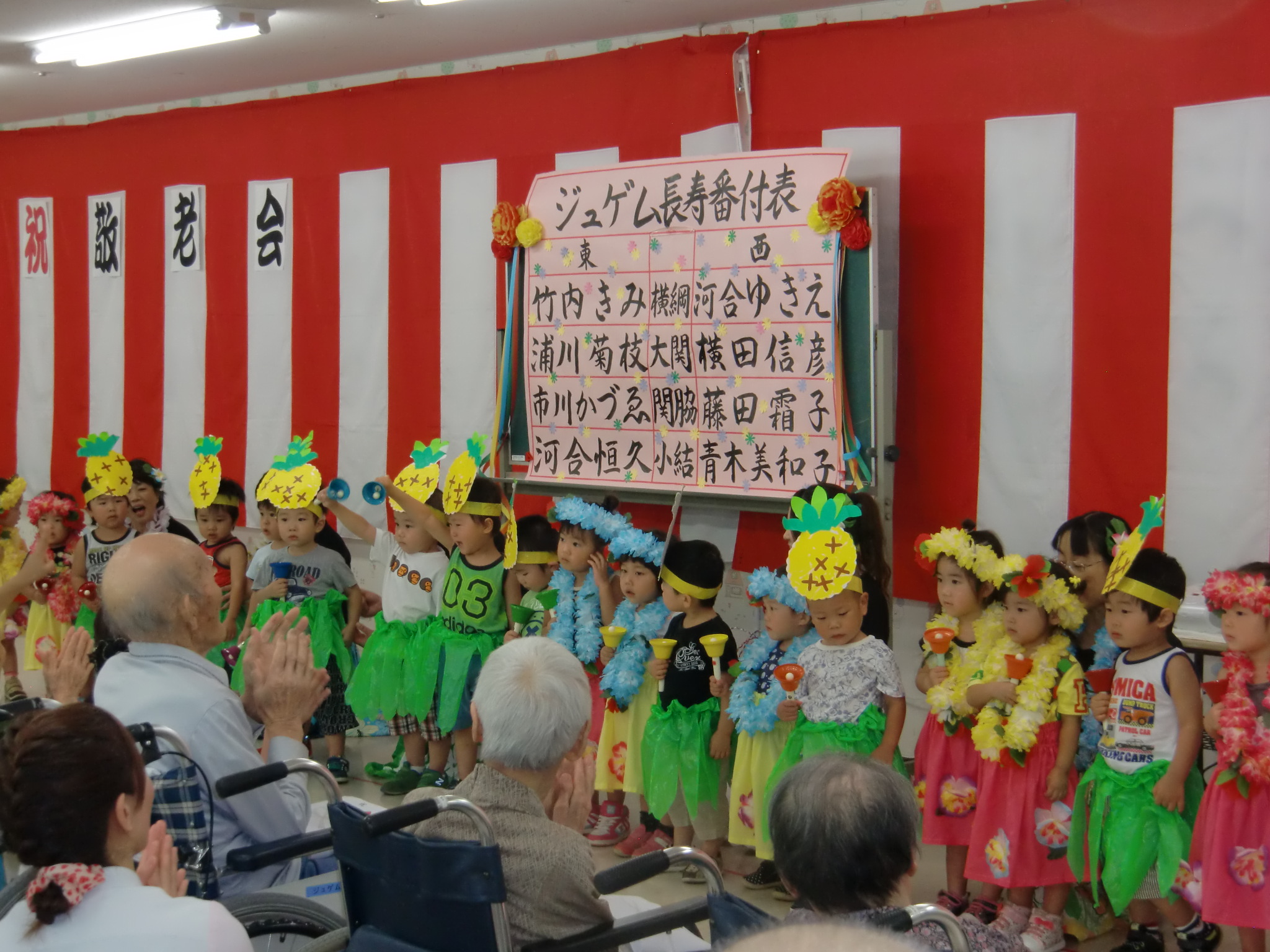 その後、福祉村保育園の園児によるお遊戯を見て頂き、 入所者様の皆様も手をたたいて、とても楽しんでおられました。 又、園児より手作りのプレゼントをされ喜んでおられました。 (ジュゲム平松)