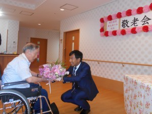 入居者の皆様は、贈られた花束や昼食のお寿司に大変喜ばれておられました。