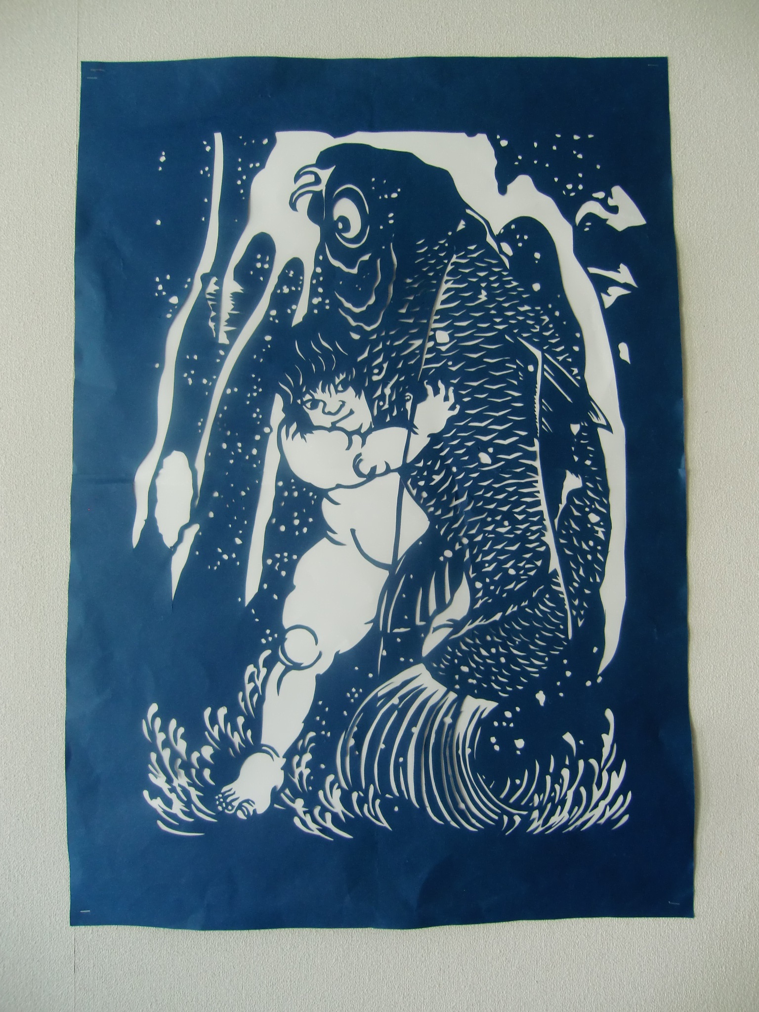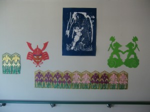 こちらの【坂田怪童丸】は、金太郎の通称で、江戸時代多くの浮世絵に描かれています。怪童丸と巨大な鯉の組み合わせは、共に端午の節句飾りのモチーフとなっています。こちらの切り絵は特に好評で、入所者の皆様に喜んでいただいています。