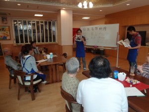 地方の郷土料理の名前を書きだして、どんな料理かを当てるという日本妄想料理クイズを行い、「じょじょ切り」の問題が出題されてなかなか答えることができませんでしたが、ヒントで「伊良湖汁粉」が出ると、ご存じの方はすぐに答えることができておりました。「お汁粉の餅の代わりに小麦粉で練ったうどんを入れたもので、渥美地方で古くから農業の合間におやつとして食べた料理として知られていたなど」名前の由来等の説明をさせていただき、地元出身者の方は「懐かしいな、すごく美味しいんだよ」などとお話ししながら、楽しい時間を過ごしていただけたかと思います。