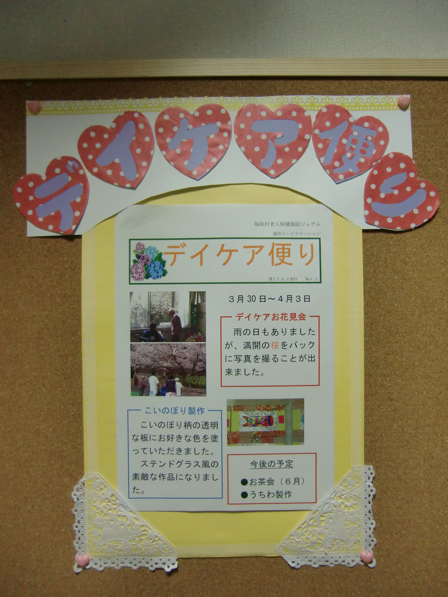 主な内容としては、レクリエーションのご様子、利用者さまの作品紹介、季節の行事などを中心に、デイケアの取り組みをお知らせしていきます。