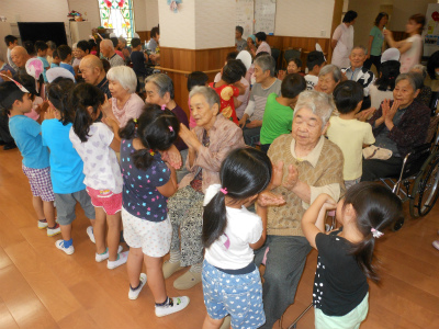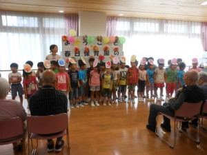 「かえるののど自慢」の劇を園児の皆さんは一生懸命、発表してくださり、「お寺の和尚さん」「一本橋こちょこちょ」の歌と手遊びでは入居者様・ご利用者様と園児の皆さんの交流で会場は笑顔と笑い声があふれました。春日保育園の皆様ありがとうございました。(常盤 藤原)