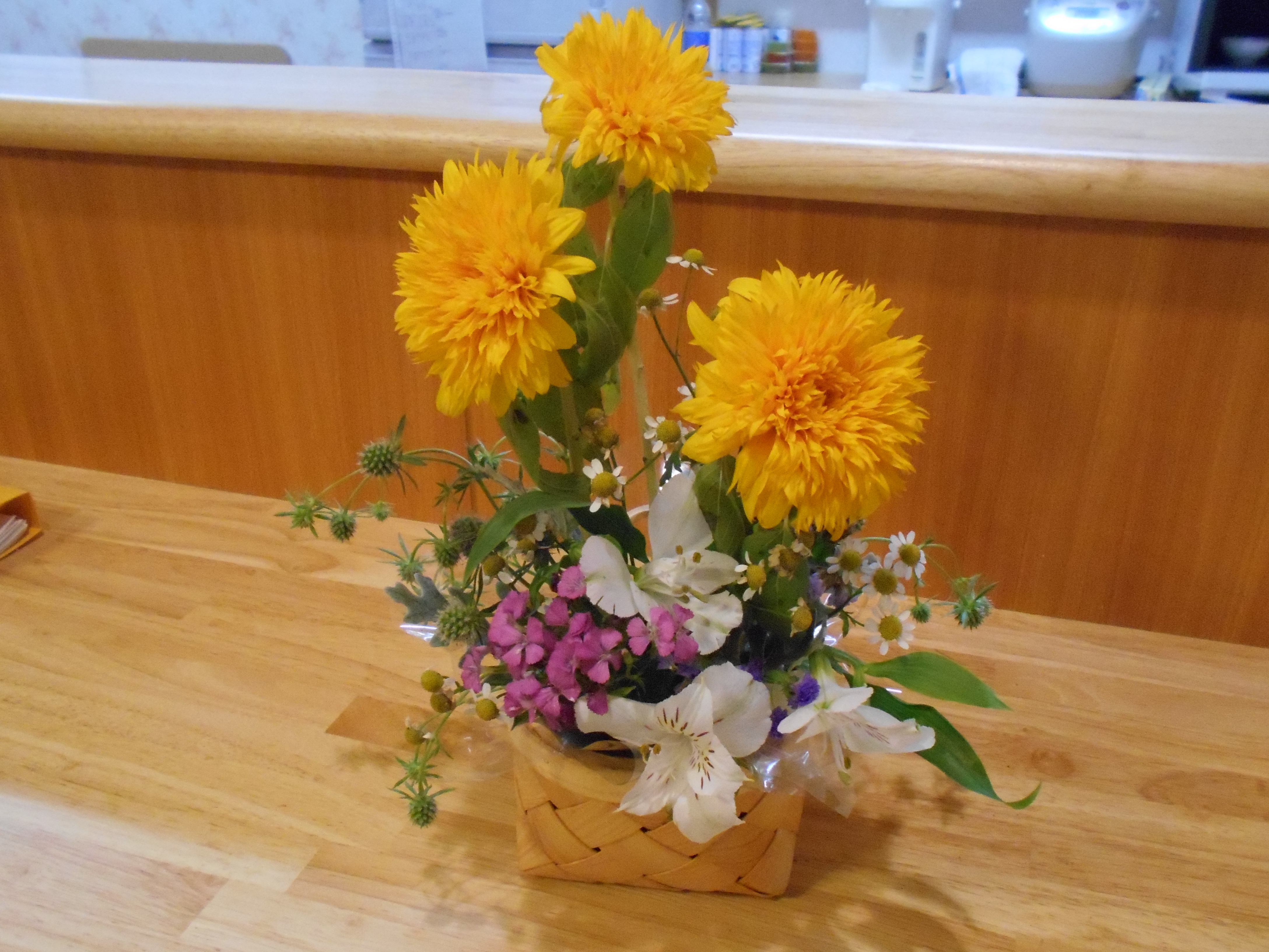 今回は、主に黄色の向日葵を主軸にしての作品作りとなりました。皆様悩みながらも楽しそうに作っておられる姿を拝見させていただくことができました。
