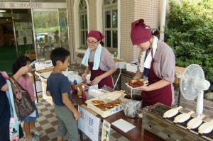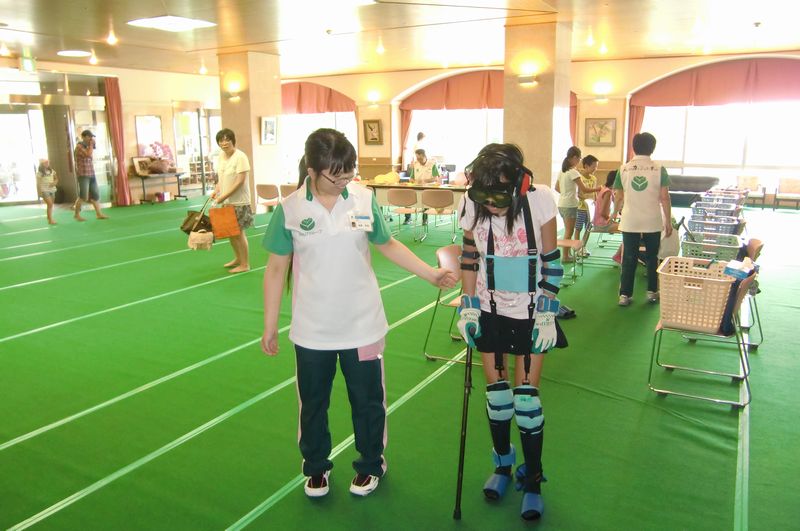 「高齢者疑似体験」コーナーでは高齢者の身体状況に似せるために、見えづらくするためのゴーグルをつけたり、ヘッドフォンをつけて耳が聞こえづらくしたり、手袋をつけて物をつかみにくくするなどして体験をして頂きました。子供さん達は「高齢者になるといろいろやりにくくなって大変だなー」と高齢者の方への気遣いを口にされていました。