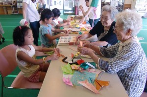 また「昔の遊び」コーナーでは、ケアハウスカサデローザの入所者の方と一緒に折り紙を折ったり、けん玉やおはじき等の昔ながらの遊びをされ楽しい時間をお過ごしいただけたようです。