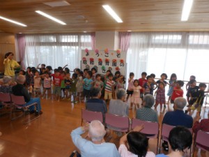 昭和保育園から45名の年中さんが、常盤に遊びに来てくれました。 園児の皆さんと入居者様と一緒に「大きな栗の木の下で」「幸せなら手をたたこう」などの手遊びで交流し、「しゃぼん玉」「アイアイ」「ドレミの歌」を元気よく歌ってくれまして、園児の皆さんに笑顔と元気をいっぱいいただきました。 昭和保育園の皆さんありがとうございました。(常盤 藤原)