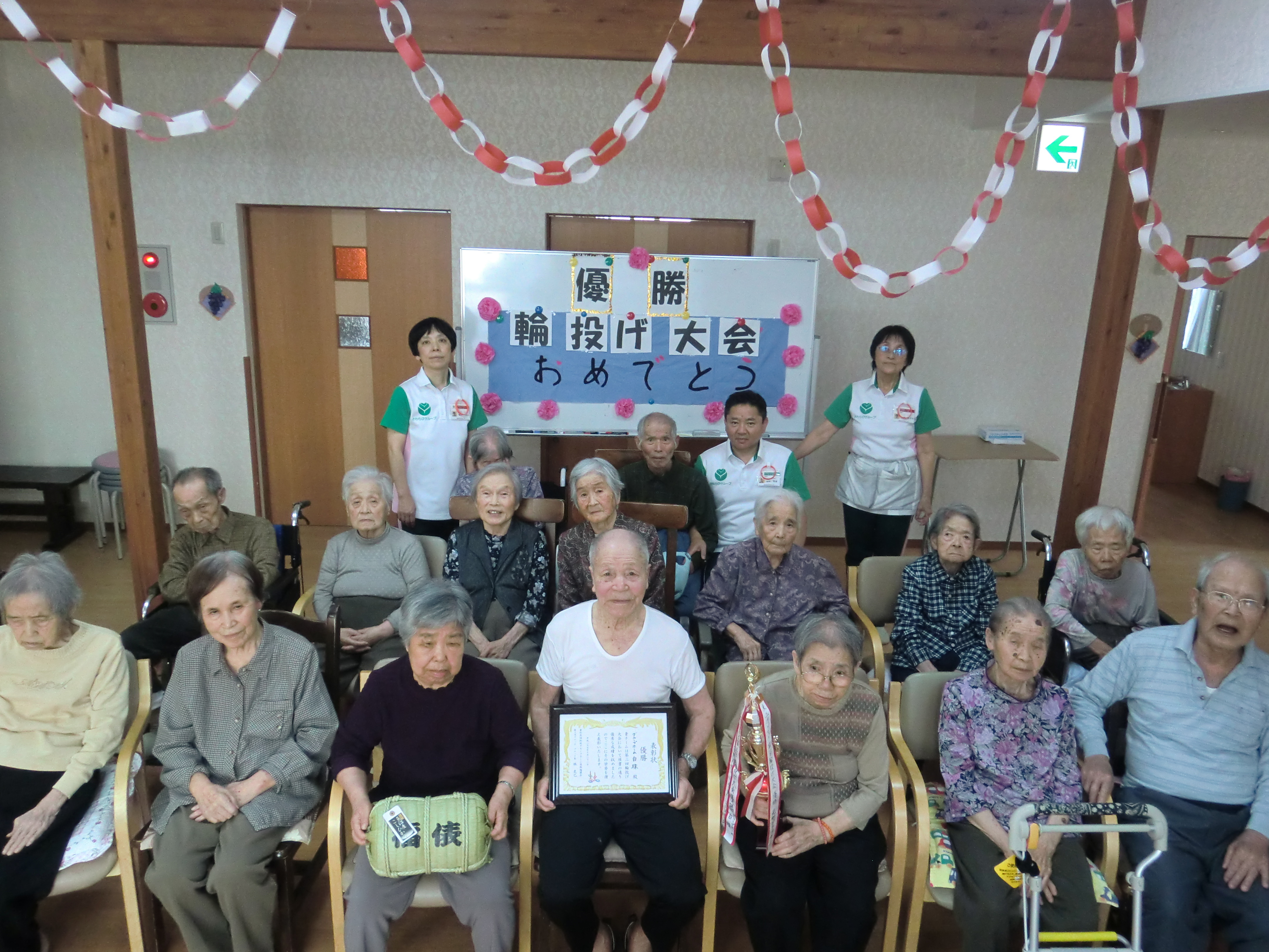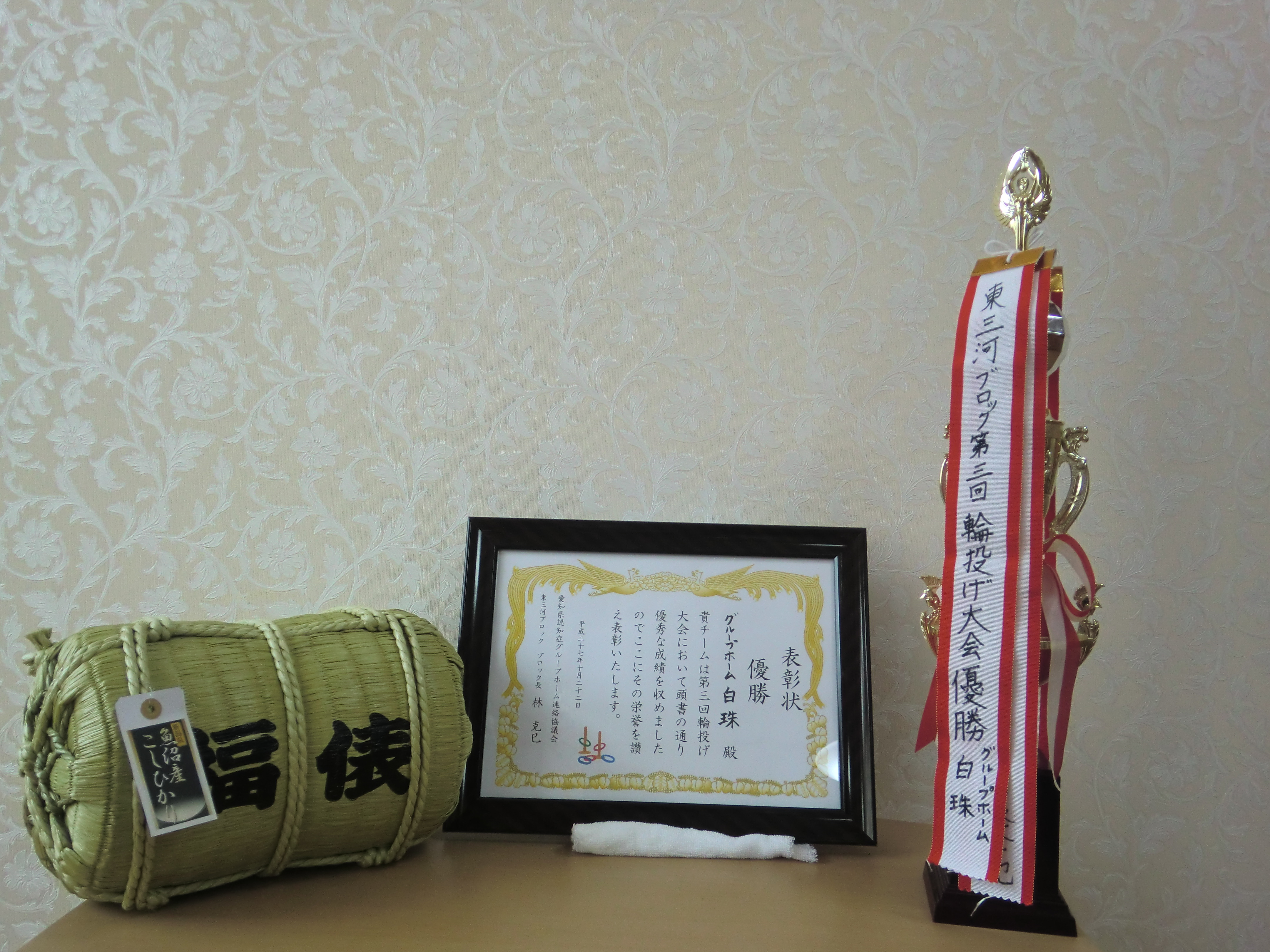 10月22日(木)愛知県認知症グループホーム連絡協議会東三河ブロック主催の第3回輪投げ大会に参加しました。23チームが豊橋市総合福祉センターあいトピアに集まりトーナメント方式で試合を行いました。1回戦、2回戦、3回戦と勝ち進み優勝することができました。さわらび会グループホームカサデヴェルデも3位に入賞されました。お互いの健闘をたたえ「来年も元気に参加して、優勝目指して頑張りましょう。」と固い約束をかわしました。優勝トロフィー、賞状、米俵を頂き、白珠で優勝祝賀会を開催致しました。皆様の喜びの笑顔です。ありがとうございました。(グループホーム白珠 白井)