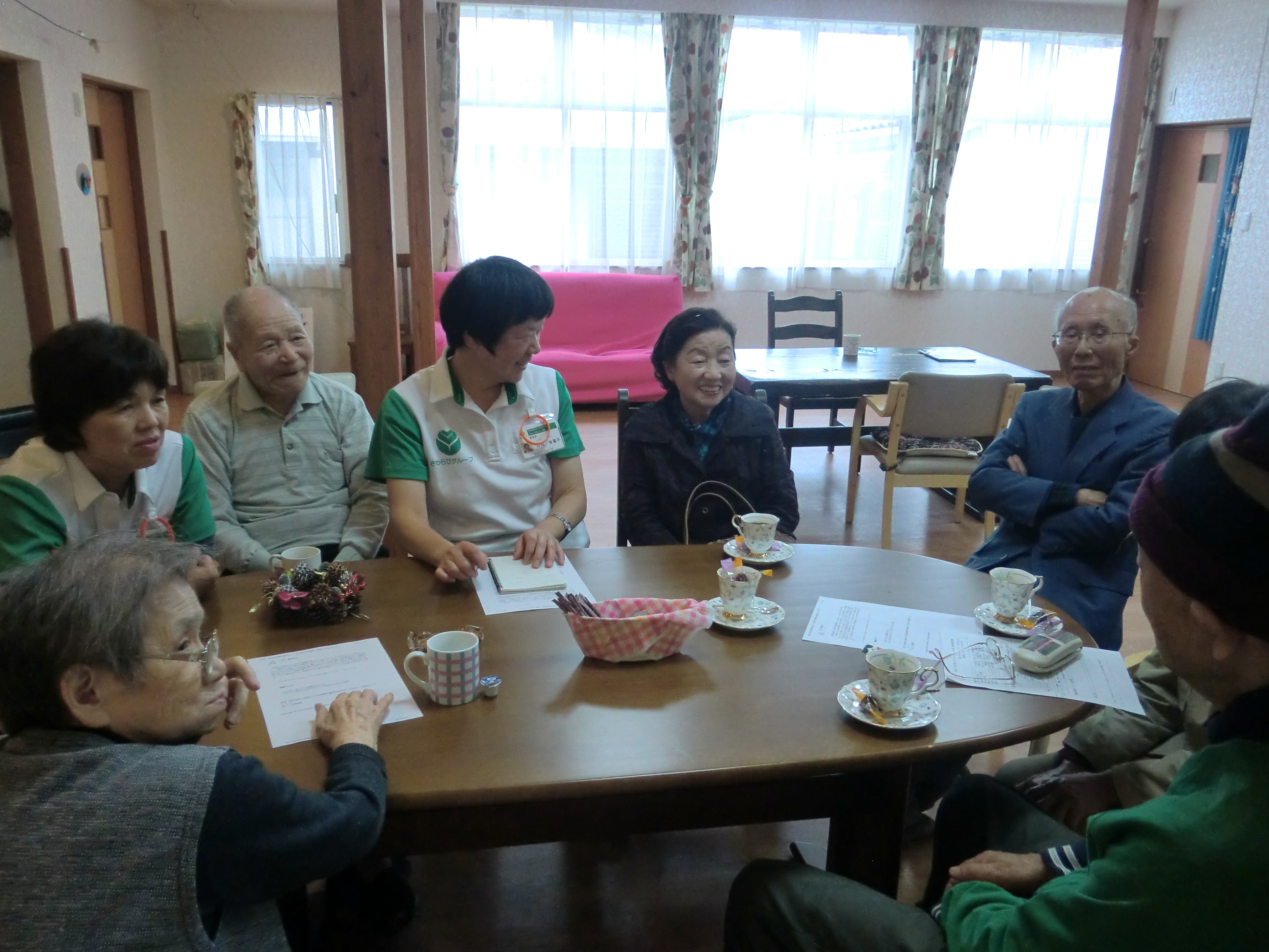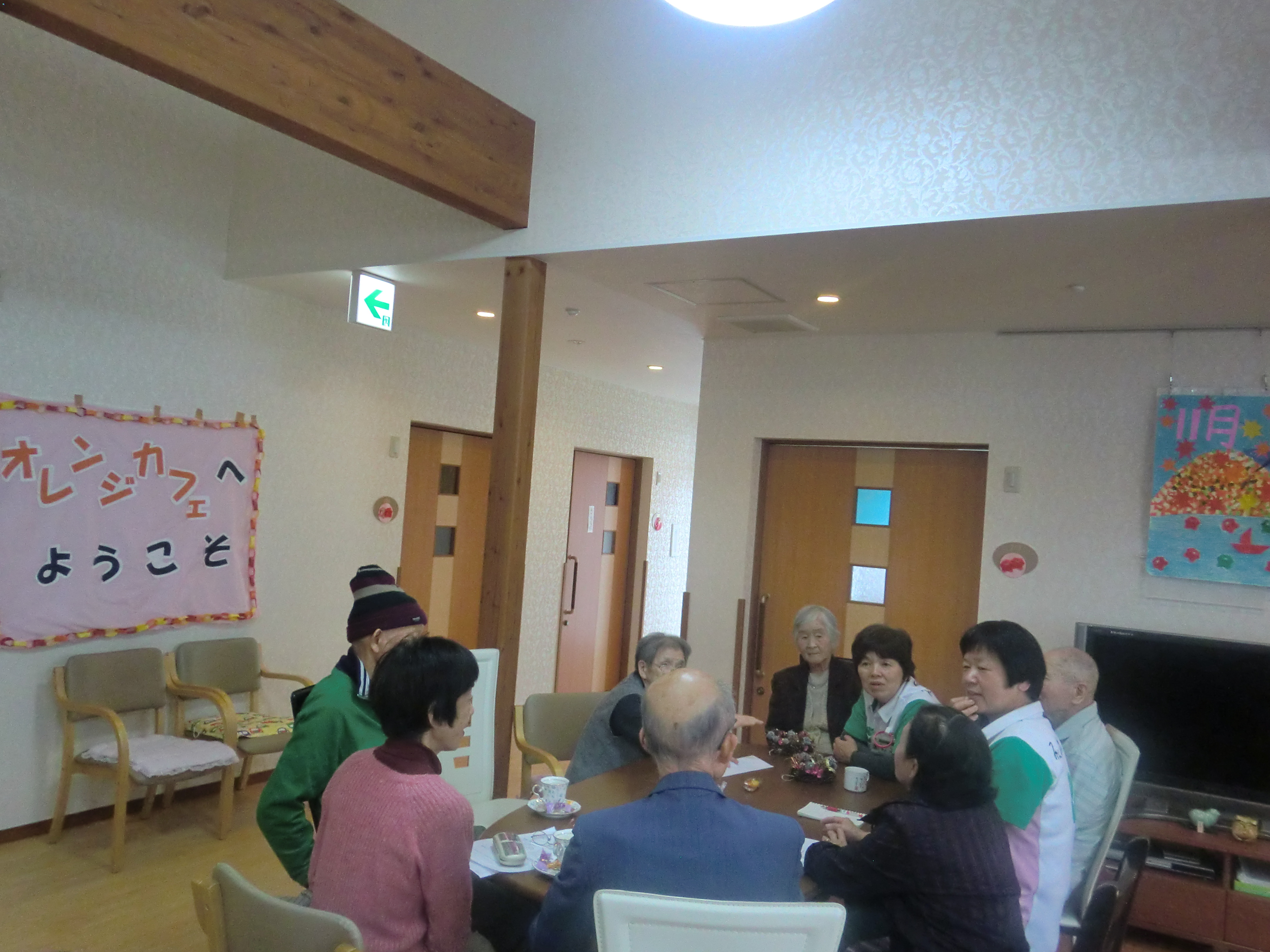 11月25日(水)にオレンジカフェを開催致しました。地域の方、ご家族様、入居者様など9名の方が参加され、色々な話題で大変盛り上がりました。「きのこの健康的な食べ方」、「筋肉トレーニング」、「社交ダンス」や「日本舞踊」など、手振り身振りも交え、皆様が今日初めて会ったと思えない程とても楽しい時間になりました。インフルエンザ予防の為、白珠オレンジカフェはしばらくお休みになります。「春にまたお会いしましょう。その日まで元気でいましょう。」と約束しました。風邪などを引かれない様体調管理に努めてまいります。(グループホーム白珠 白井)