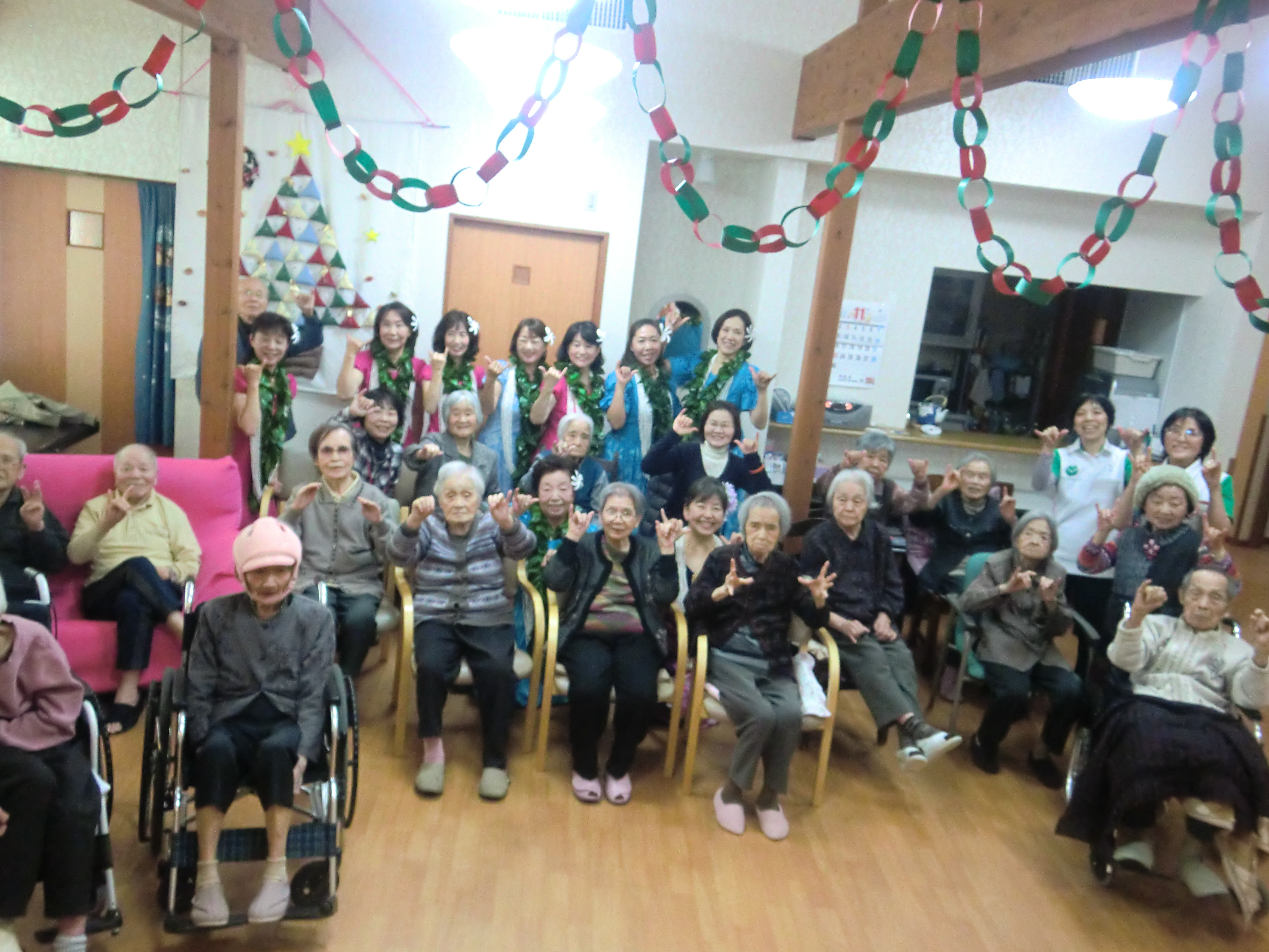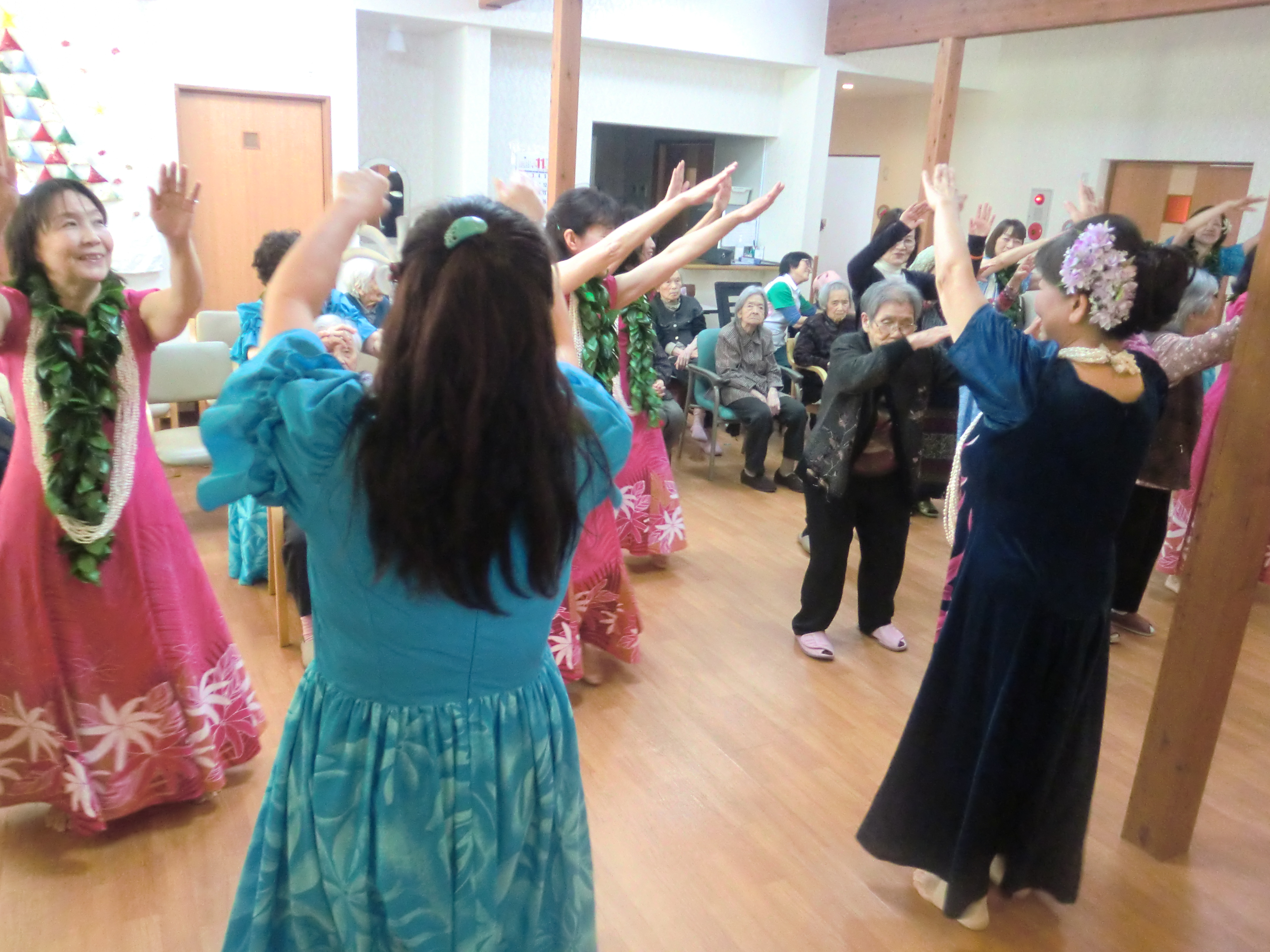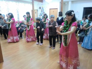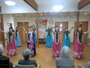 11月27日(金)グループホーム白珠では、中野真理子先生率いる「フラ アロハ キング」9名様の慰問がありました。リビングは、一瞬にして常夏のハワイになりました。素敵な衣装と暖かい笑顔、曲に合わせて情感たっぷりにフラダンスを披露して下さいました。見学者も手ほどきを受け、思いを込めて楽しく踊りました。その時の様子を是非ご覧下さい。素晴らしい時間を「フラ アロハ キング」の皆様ありがとうございました。(グループホーム白珠 白井)