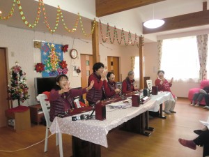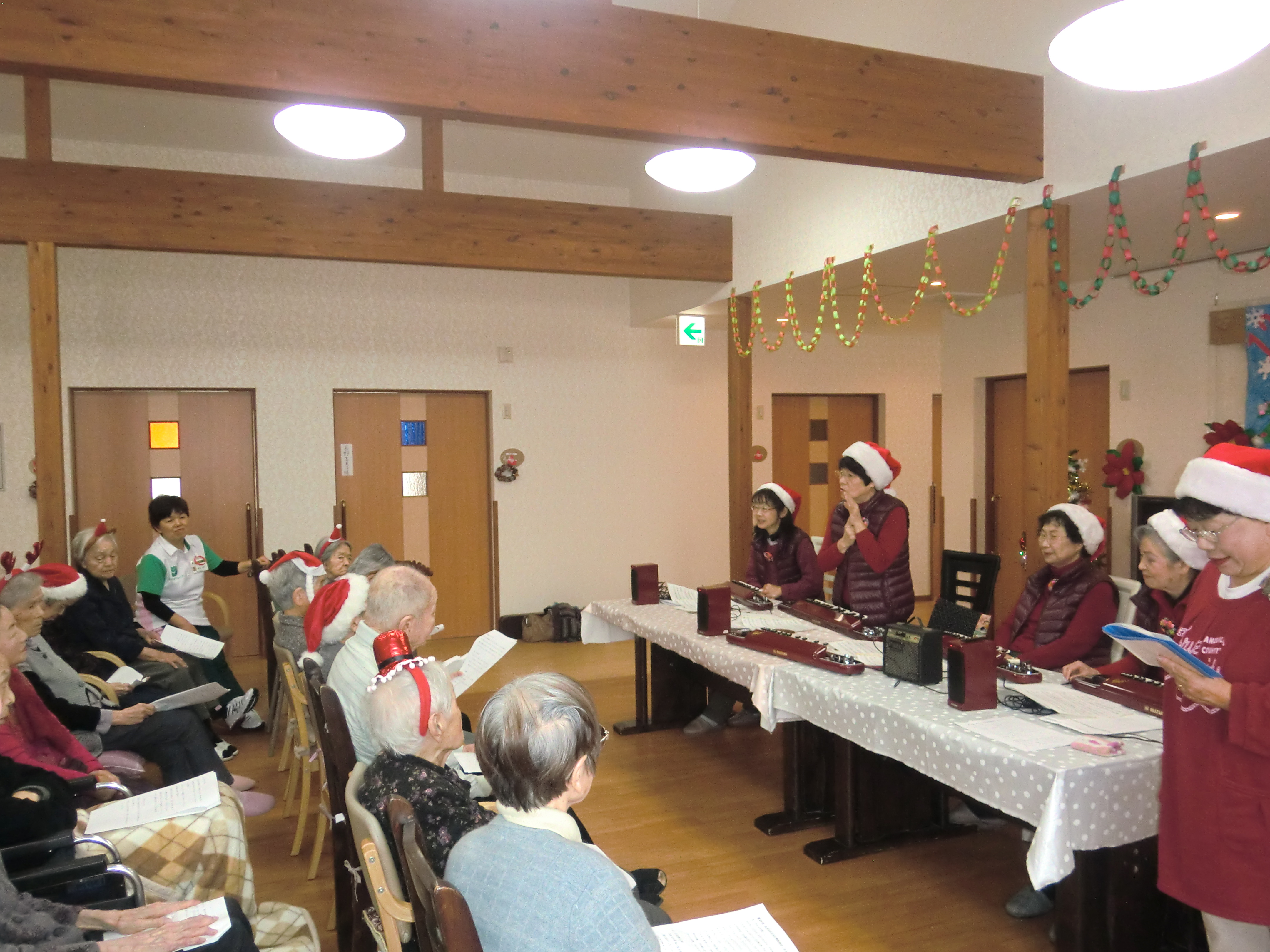ボランティアグループあざみの会5名様による、大正琴クリスマス演奏会が開催されました。今回で25回目の慰問です。入居者様も赤いサンタクロース帽子やトナカイのカチューシャを身に着け、ムード満点に皆様をお迎えいたしました。おしゃべりを交えた楽しい演奏会でした。「クリスマスソング」と「お正月」も歌いました。「クリスマスとお正月が一緒に来たようで、とても得した気分です。」とあちらこちらで聞こえました。素晴らしい演奏をありがとうございました。これからもよろしくお願いいたします。(グループホーム白珠 白井)