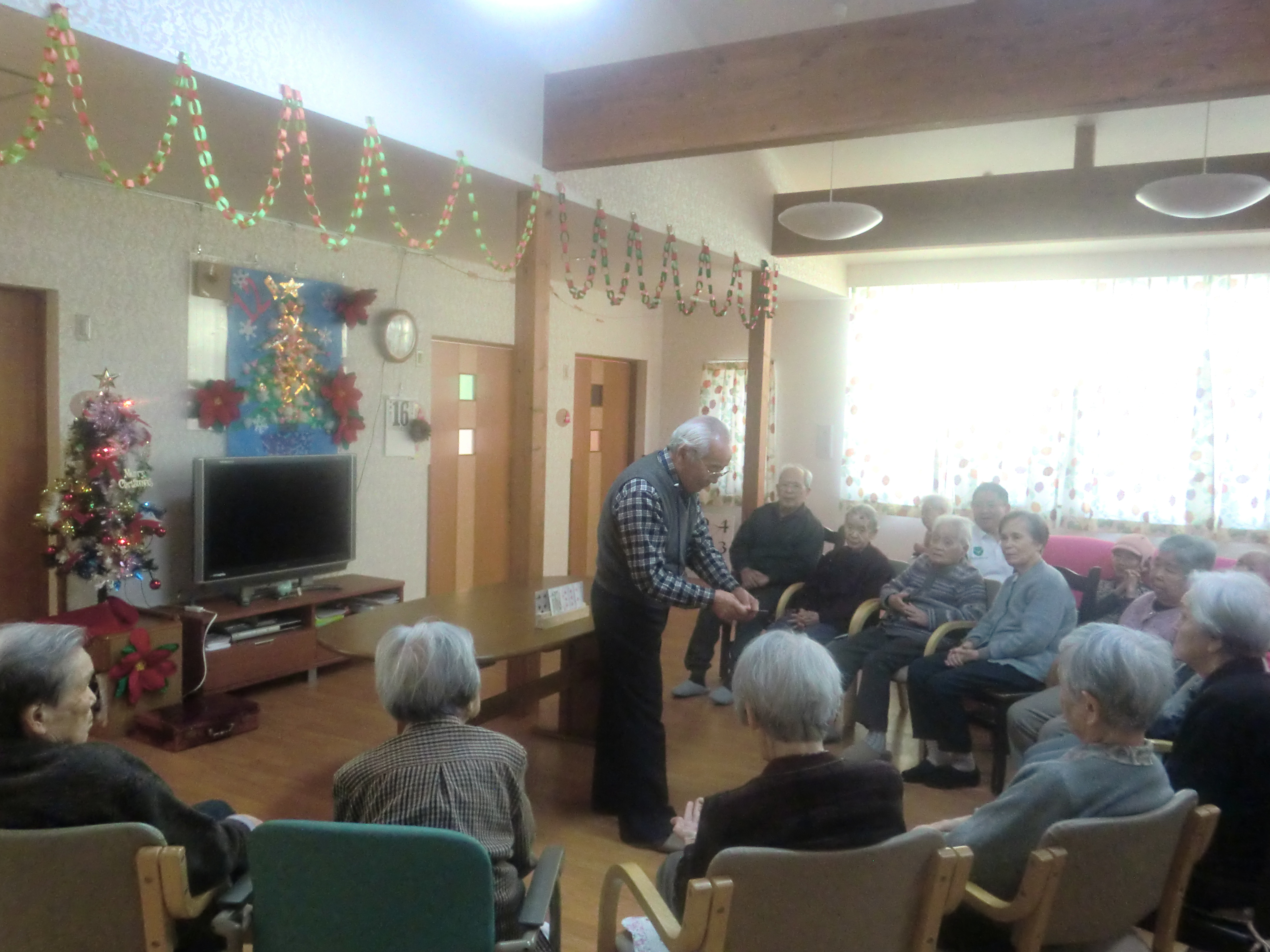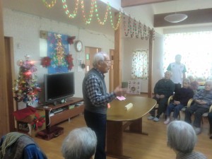 岩月淳一様による手品と懐かしの唄が開催されました。岩月様は、毎月白珠へ慰問に訪れて下さっています。今日は、本邦初公開、紐を使った手品とトランプの数字当て手品を披露して下さいました。どこに秘密があるのか、皆様は手元を真剣に見ていましたが、まったく分かりませんでした。懐かしの唄では、昭和の唄「人生の並木道」「無法松の一生」「柔」などを大きな声で歌いました。中には、歌詞が続く限り4番まで独唱される方もあり、大きな拍手と笑い声が起こりました。楽しい時間をありがとうございました。(グループホーム白珠 白井)