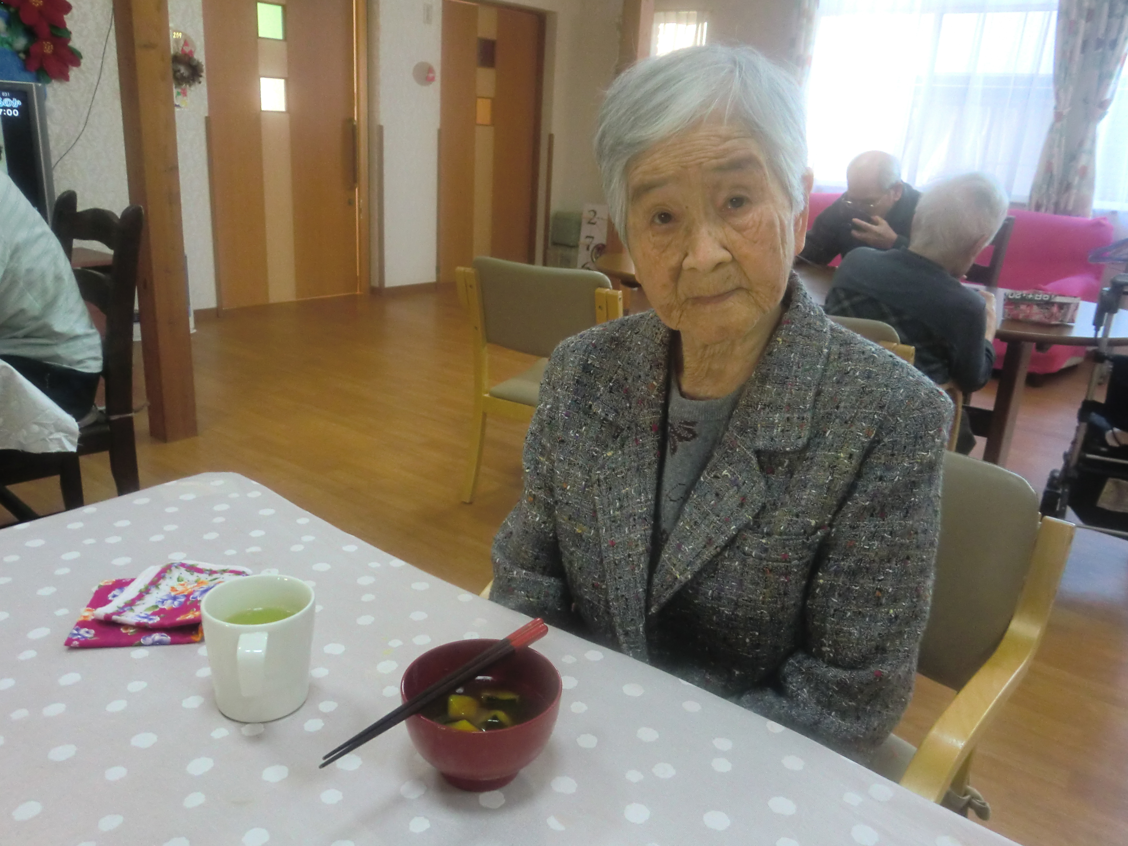 12月22日は冬至です。「冬至にかぼちゃを食べると風邪を引かない。」と言われています。白珠では3時のおやつにかぼちゃ汁粉を作った所、とてもおいしく出来上がり「もっとないですか。」と大好評でした。また、ご近所で頂いた柚子を使い、柚子湯を用意しました。浴室には良い香りが漂い身体が温まり大変喜んで頂けました。柚子湯も風邪予防の効果があります。風邪を引かれない様に、季節の行事も取り入れて楽しく健康に暮らして頂きたいと思います。(グループホーム白珠 白井)