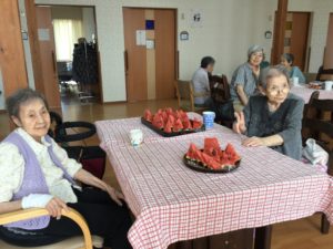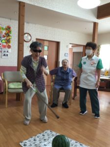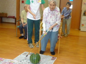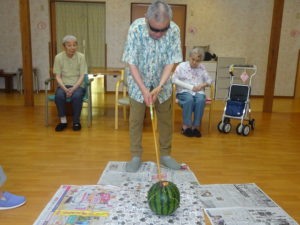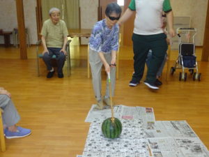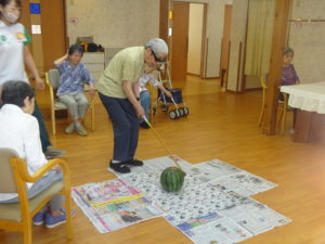 今年の夏まつりは、各ユニットでプチ夏まつりということでスイカ割りを実施しました。