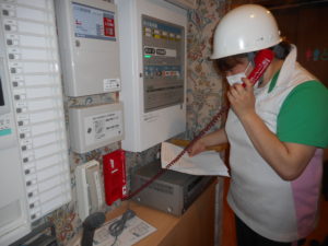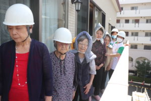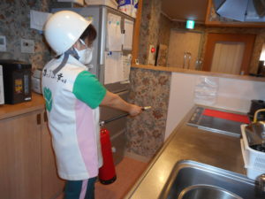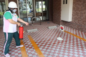防災訓練を行いました。今回は非常通報装置を使い、実際に消防署へ通報しました。初めに館内放送で訓練火災が発生したことを放送しました。消火器による初期消火、消防署への通報、入居者様の避難誘導、一つ一つを確認しながら行いました。また、消防署から水消火器をお借りして、実際に消火器の取り扱い方も体験しました。緊急時、迷わず素早く対応ができるようにこれからも訓練を行って行きます。