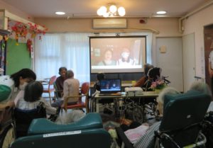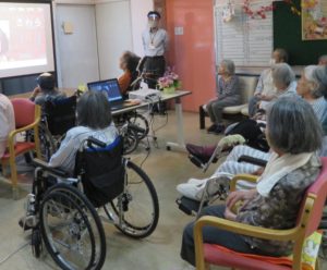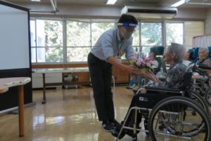 毎年敬老の日に合わせて敬老祝賀会を行っておりましたが、今年は新型コロナウイルス感染対策のため、合同で行う敬老祝賀会の開催を中止させていただきました。そこで、皆様の長寿をお祝いさせていただくため、今年はご家族様にもご協力をいただき、お祝いのメッセージビデオを作成し各階で上映をさせていただきました。8月下旬ごろからオンライン面会等で来荘された14組のご家族様にお祝いのメッセージをいただき上映を行いましたが、うれしさで手を振って応えられた入居者様もおみえになりました。また上映後は家族会から造花のアレンジ花をプレゼントしていただき、各階の最高齢者の方に代表で受け取っていただきました。皆様これからもお元気でお過ごしください。また、ご家族の皆様、ありがとうございました。(さわらび荘 渡邊)