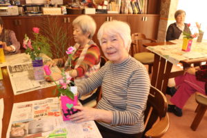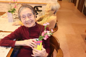 生け花教室を開催致しました。本日の花材はバラ、カーネーション、アスパラ、金魚草です。それぞれのお花が色々なピンク色です。淡いピンク、ショッキングピンク、桃色…。「まあ、今日はピンクで楽しいですね。」と入居者様から声が上がりました。アスパラの葉グリーンがとても鮮やかで、ピンク色を引き立たせます。完成した作品はお部屋に飾りました。(フジ 白井)
