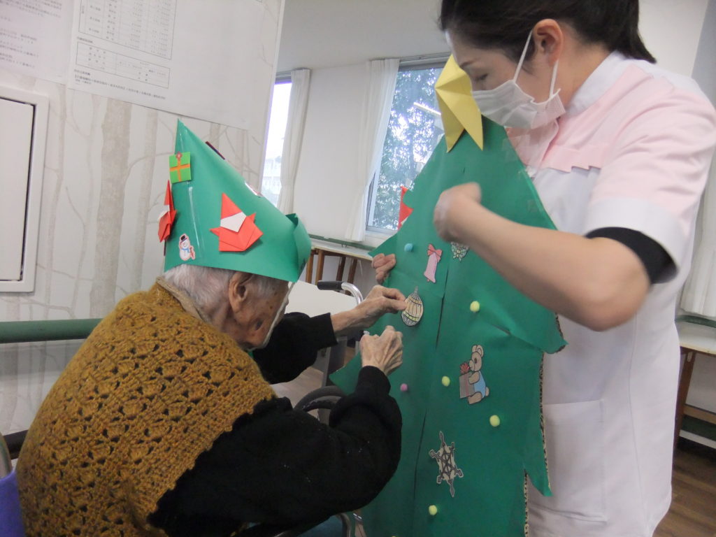 入所様と職員とで一緒に作った、クリスマス飾りに彩られた各フロアの談話室でクリスマス会はスタートしました。