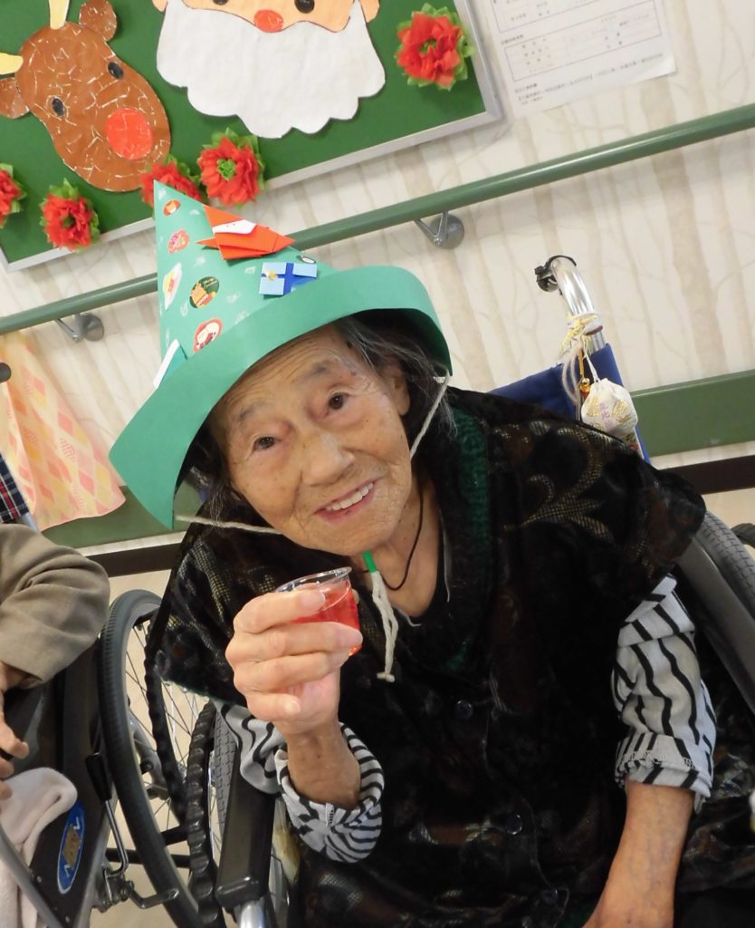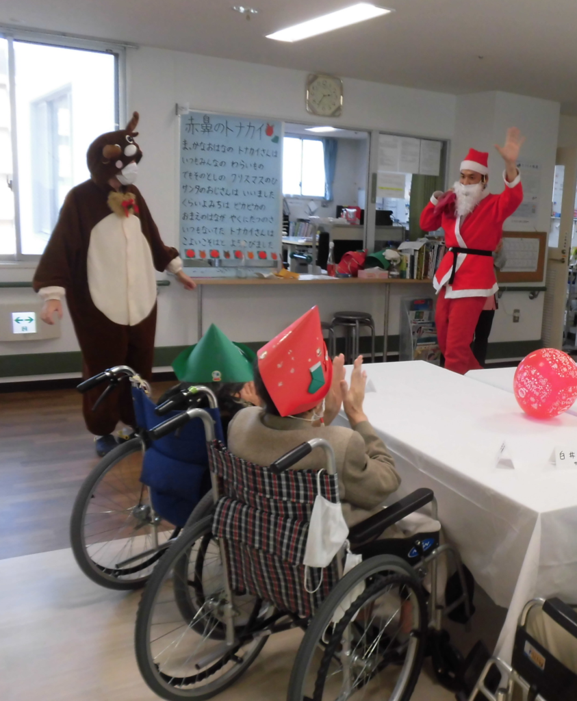 職員が扮する「サンタ」と「トナカイ」が現れると、入所様は手をたたいて喜ばれ、一人一人にプレゼントが手渡されると皆さん笑顔で大喜びされていました。