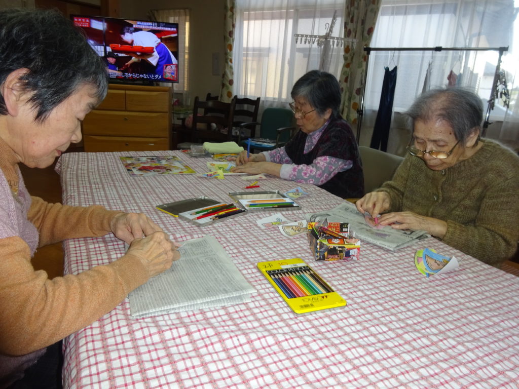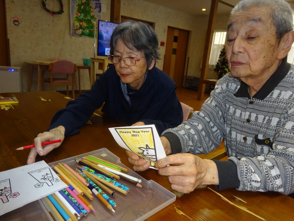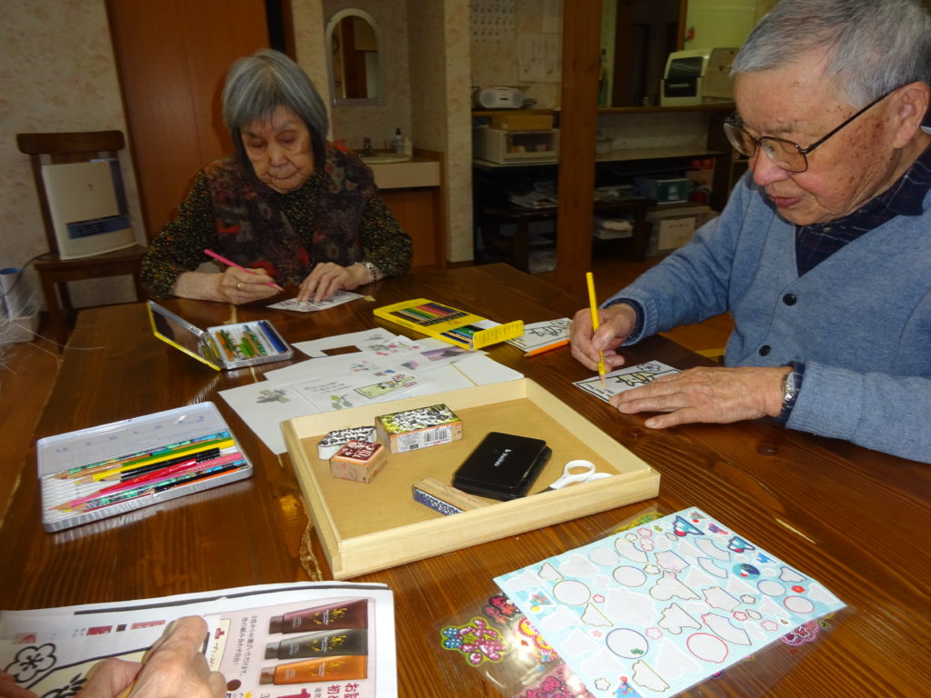 ぬり絵、スタンプ、シールといろいろ考えてかわいい年賀状が仕上がりました。