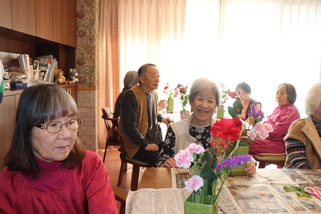 毎月第4火曜日の午後は生け花教室を開催しています。新型コロナウイルス感染症予防対策の為各ユニットに分かれて行っています。各階に生け花が得意な入居者が在籍され、その方が中心となり楽しく活けています。完成した物は、それぞれの居室に飾り季節を感じて頂いています。
