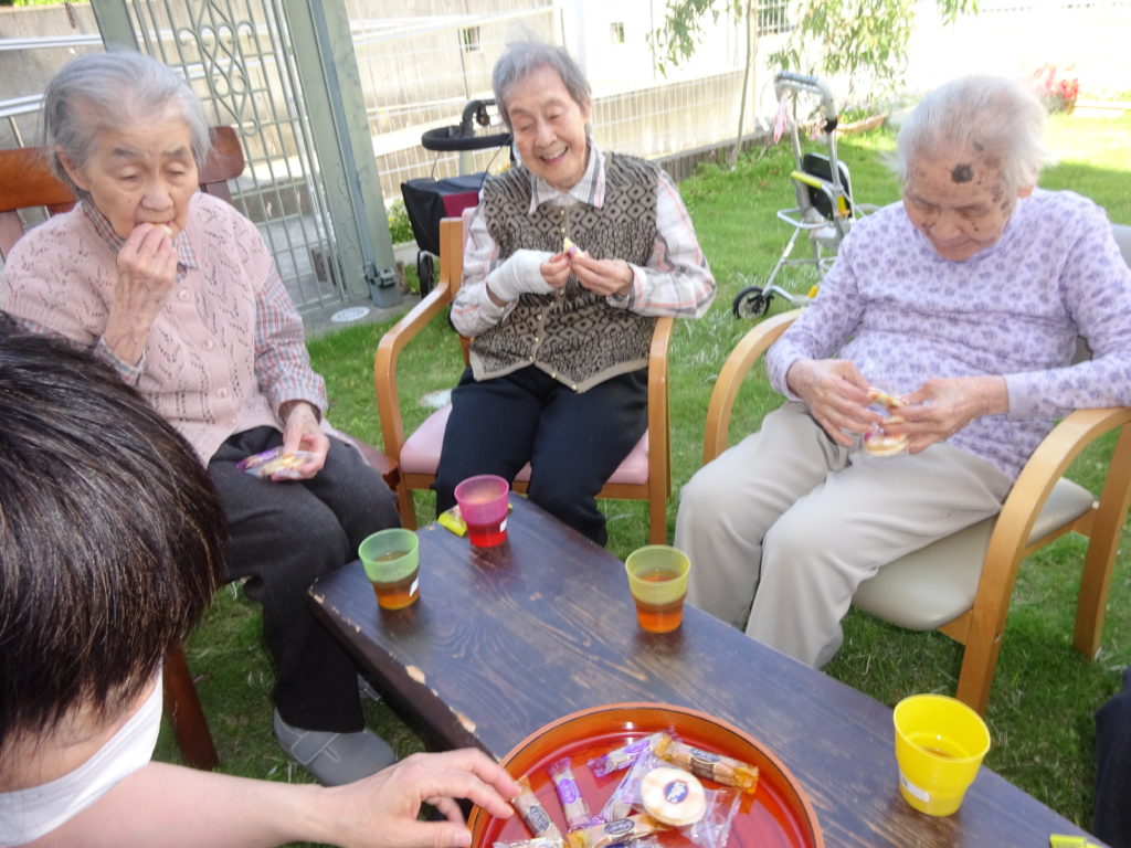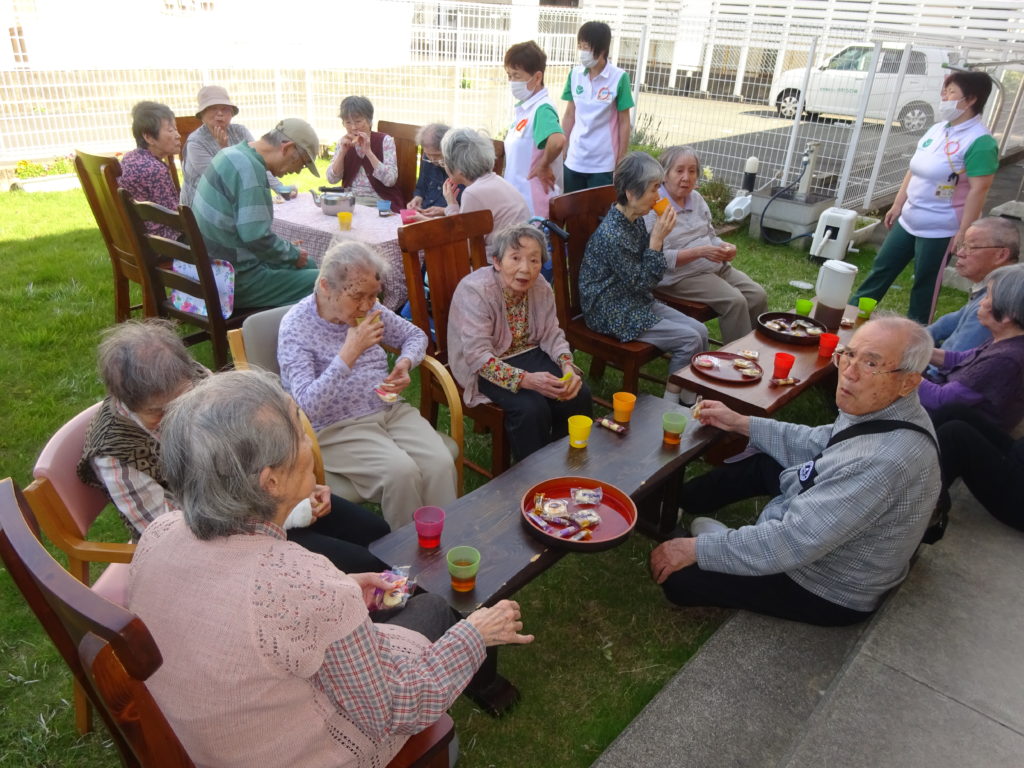 「皆さんで行けるといいね」ということで、庭でお茶会、おやつバイキングを開きました。