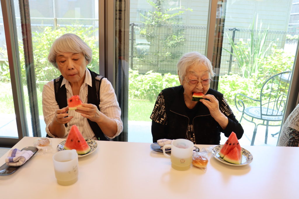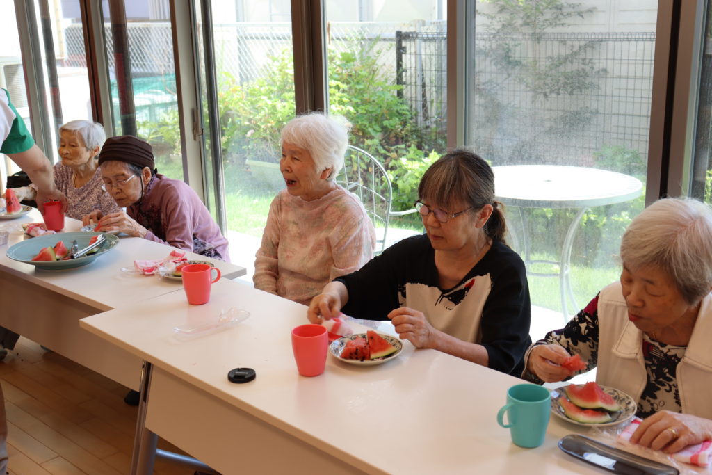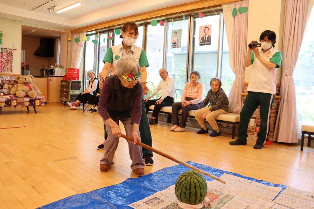 新型コロナウイルス感染症を防止する為、ユニットが午前、午後に分かれて「すいか割り大会」を開催致しました。皆様には「すいか」が見えないように、工夫したかわいい眼鏡を付けて頂きました。「すいか」めがけて、力いっぱい竹刀を振り下ろすと見事に二つに割れました。割れた「すいか」は美味しくお腹いっぱい食べました。夏も良いですね。(フジ白井)