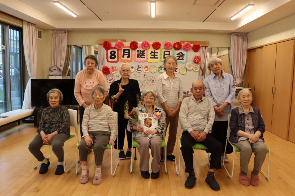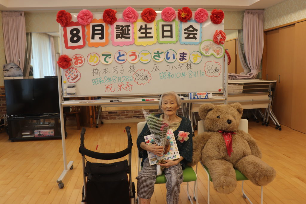 新型コロナウイルス感染症予防対策の為、8月の誕生日会をフジ2は17日、フジ3は18日に分かれて開催致しました。2名の方がお誕生日を迎えられ皆様から「おめでとうございます。」のお祝いの言葉とプレゼントを頂きました。「何歳になっても嬉しいですね。」と、とても喜んで下さいました。「お誕生日おめでとうございます。これからもお元気でお過ごし下さい。」