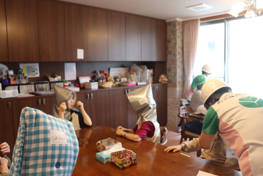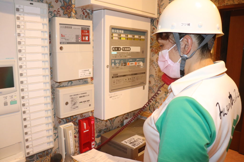 防災訓練を行い、今回は実際に非常通報装置を使い消防署へ通報する訓練も同時に行いました。「訓練火災発生。」のアナウンスから始まると皆様は防災頭巾、ヘルメットをかぶり素早く逃げる体制に入りました。通報ボタンを押すと非常通報装置からフジの住所、電話番号などが大きくアナウンスされ、皆様は少し緊張されました。初期消火、避難誘導後、訓練終了。無事に非難することが出来ました。これからも繰り返し訓練を致します。