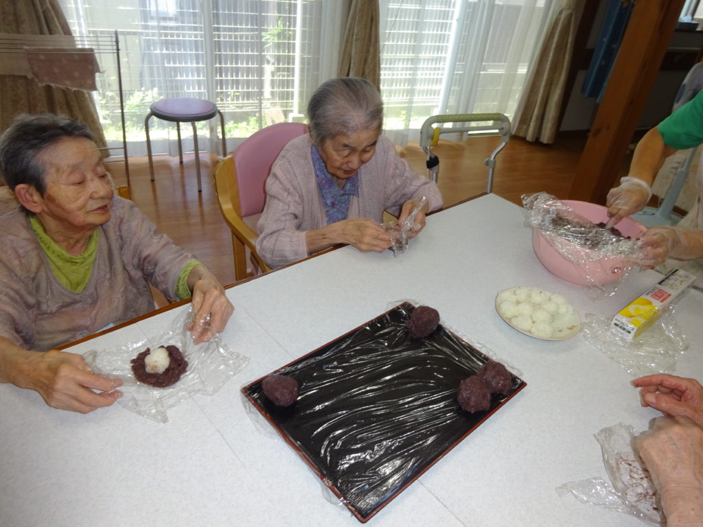 ごはんを少しつぶしてお好みの大きさに丸めてあんこで包みます。