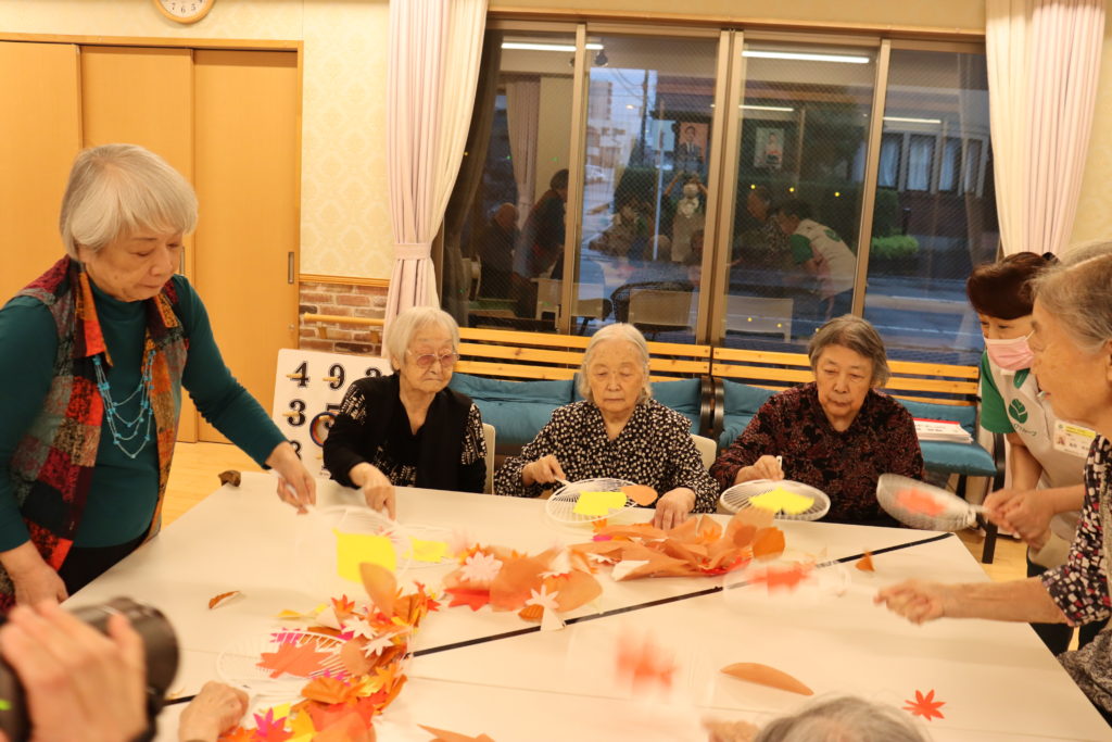 「秋の味覚祭り」を開催致しました。秋の味覚といえば、柿、栗、サツマイモですね。フジでは皆様に楽しんで頂こうと、腕によりをかけ季節のスイーツを作りました。見て下さい柿プリン、栗ぜんざい、焼き芋です。全てを美味しく頂きました。また、手作りした落ち葉が舞い散るゲームも行い多目的室は笑顔で一杯、楽しい秋のひと時になりました。(フジ白井)
