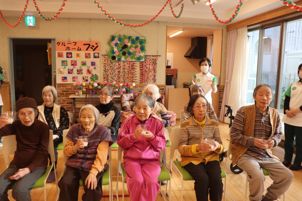 12月誕生日会を1階多目的室で開催致しました。翌日が彼女の本当のお誕生日です。フジ最高齢の97歳になられます。皆様から手作りの色紙と素敵な花束のプレゼントを頂きました。ハッピーバースデーの歌と「おめでとう。」のお祝いの言葉の中、ジュースで乾杯をしました。これからもお元気でお過ごし下さい。「おめでとうございます。」 (フジ白井)