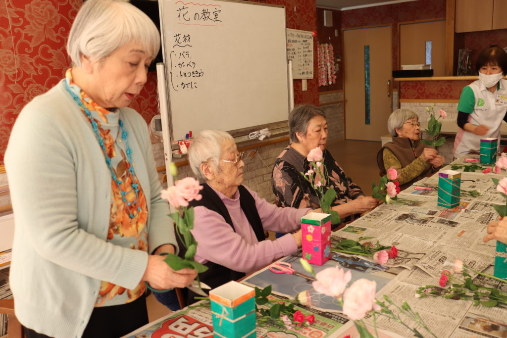 今年最後の生け花教室を開催致しました。今日の花材は、赤いバラ、濃いピンクのガーベラ、淡いピンクのなでしこ、清楚なピンクのトルコききょうでした。フジ3は「花の教室」として、入居者様が先生を務めて下さいました。とても素敵で綺麗なお花と一緒に皆様は、笑顔でポーズを決めて下さいました。完成した作品は、それぞれのお部屋で輝いています。(フジ白井)