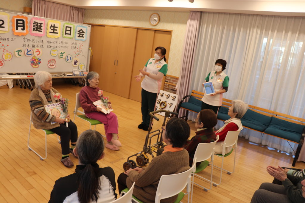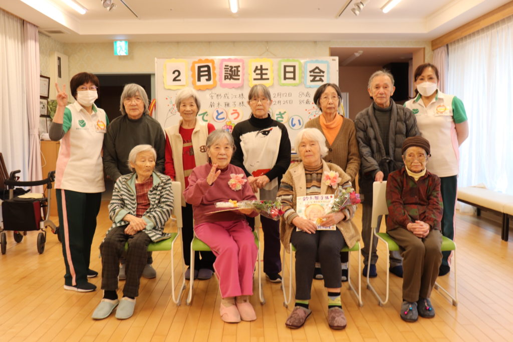 2月誕生日会を開催致しました。今月は、フジ2の2名の方がお誕生日です。外では雪がちらちらと舞っていますが、多目的室はとても暖かくまるで春の様です。。ジュースで乾杯をして、お祝いの歌を歌いました。皆様から手作りの色紙と、かわいい花束のプレゼントを頂きとても喜んで下さいました。「お誕生日おめでとうございます。」 フジ白井