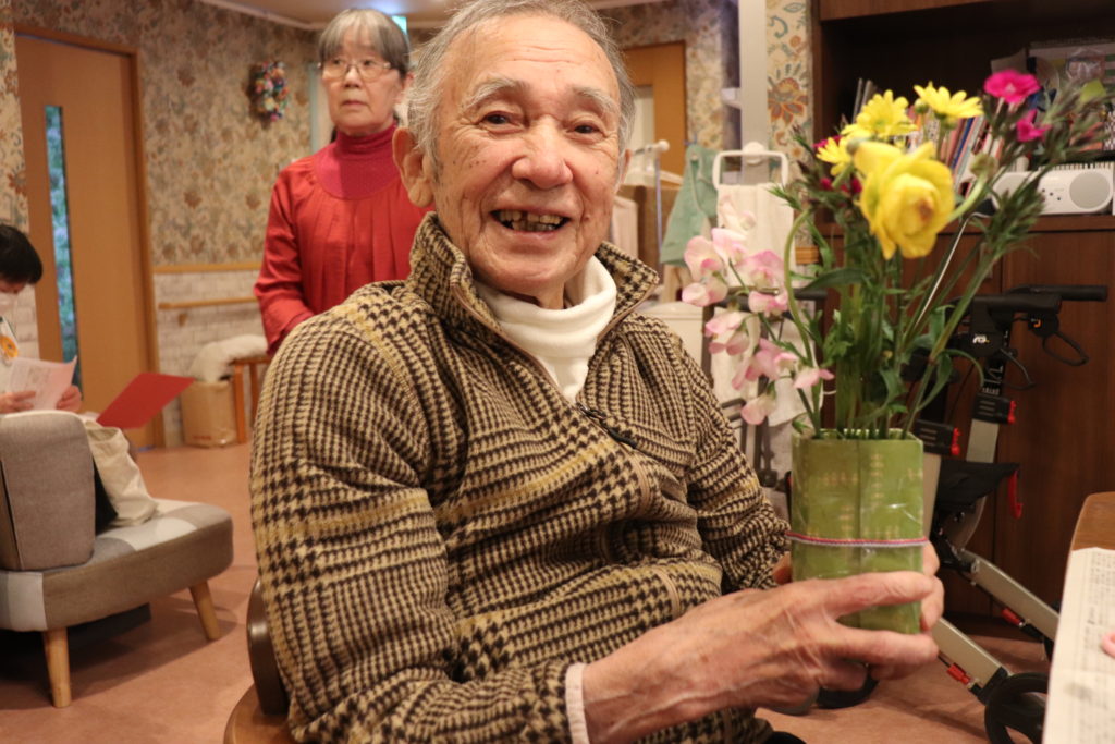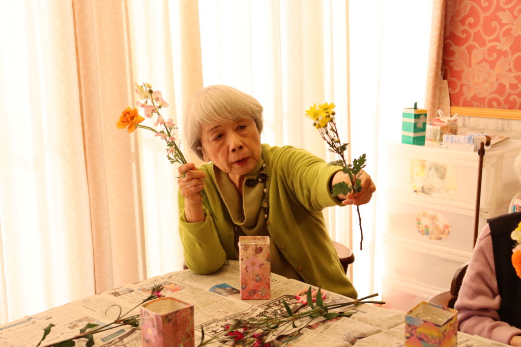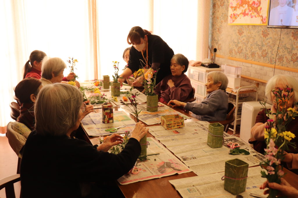 GHフジでは、毎月第4水曜日の午後、生け花教室を開催しております。近所のお花屋さんから今日は、ショッキングピンクのなでしこ、黄色の小菊、ピンクのスイトピー、オレンジ色のラナンキュラスが届きました。色とりどりのお花に一足早い春を感じます。フジ3では、入居者様が先生となりお花の説明から始まりお手本を活けて下さいます。フジ2は職員と一緒に活けました。作品と一緒に記念撮影です。皆様は素敵な笑顔でした。 (フジ白井)